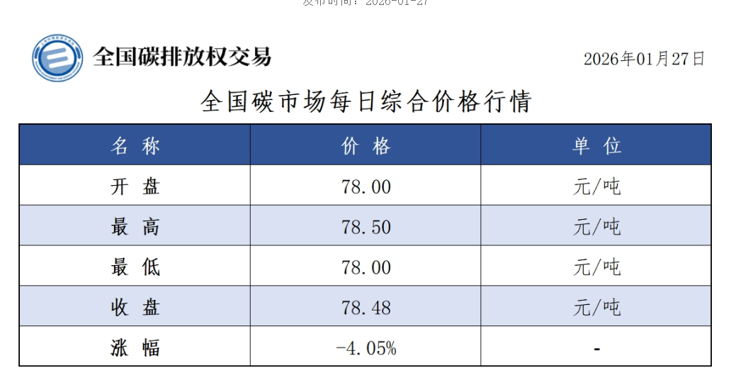 1月27日讯: 今日全国碳市场综合价格行情为: 开盘价78.00元/吨,最高价78.50元/吨,最
