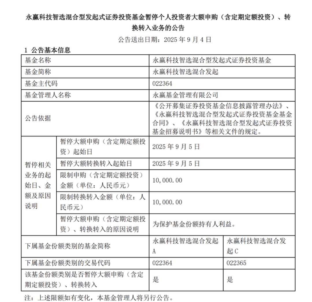 值得一提的是,该基金近期业绩上涨尤其明显,近一个月涨幅超47%。在此前的8月26日,永赢基金曾发布公告称,永赢科技智选于8月27日起暂停大额申购,单日限制申购金额为100万元。仅仅一周之后,该基金再度加码限购金额降至仅1万元。 该基金半年报曾表示:我们在季报中连续提示,永赢智选系列是聚焦新质生产力的工具型产品,其所布局的行业具有高成长性的特性,难免伴随着较大的市场波动。越是在市场热度高的时候,我们越是要认识到做好适当性管理的重要性,根据自身风险承受能力审慎决策。在投资之前,要先问自己三个问题:第一,这个产品的底层资产是什么,是否已经通过底层资产了解清楚产品的特性?第二,这类产品历史的最大回撤是多少,假如遇到极端情况,自己能否接受?第三,这笔投资期限有多长,自己对产品的预期收益率在什么区间以及是否愿意为此承担较大风险? 展望下半年,该基金将重点关注全球前沿模型的发布,新兴应用的发展,以及OpenAI/Anthropic、海外云和芯片厂商、国内相关公司如光通信(CPO)、PCB等的经营状态,积极挖掘全球云计算产业的投资机会。 “作为基金管理人,我们希望先讲风险,再谈收益,投资者要充分了解基金的风险收益属性,才能确定自己是否适合做这个投资。由于投资者行为的不确定性,投资者的真实收益和基金收益率总是存在一定的磨损,唯有更加理性的投资动作才能把基金净值转化为实实在在的投资者收益。故我们倡导分散投资、定投并设置止盈止损目标、不暴露太多风险敞口,用科学的资产配置策略守护财富。”永赢基金表示。 绩优基金纷纷限购 值得关注的是,近期随着市场回暖,公告限购的基金数量逐步增长。Wind数据显示,8月以来,已有超百只基金公告限购。 如,9月4日,中银美元债债券(QDII)公告,自2025年9月5日起,本基金人民币A类和C类基金份额均暂停接受单日单个基金账户单笔或累计超过1万元(不含1万元)的申购及定期定额投资申请请。 8月25日,华泰柏瑞基金宣布,自8月26日起对旗下中证2000指增产品限购,限购金额低至10万元。 8月9日,中欧科创主题和中欧医疗创新分别发布公告称,单日单账户限购100万和10万元,自8月11日起生效。 业内人士表示,基金主动实施限购,尤其是绩优基金的限购,一是保护现有持有人利益:避免因规模急剧膨胀导致投资策略失效、交易成本增加、优质投资标的稀缺等问题,力求维持基金业绩的稳定性和可持续性;二是维护策略有效性:保障基金经理能在其能力圈和既定策略框架内高效运作,避免因规模过大而被迫投资次优标的或改变策略;三是提升投资体验:减少规模波动对基金运作的冲击,力求为投资者提供更平稳、更可预期的回报路径。这些是当下基金公司正从规模导向向投资者回报导向转型的重要信号。 校对:王朝全 |