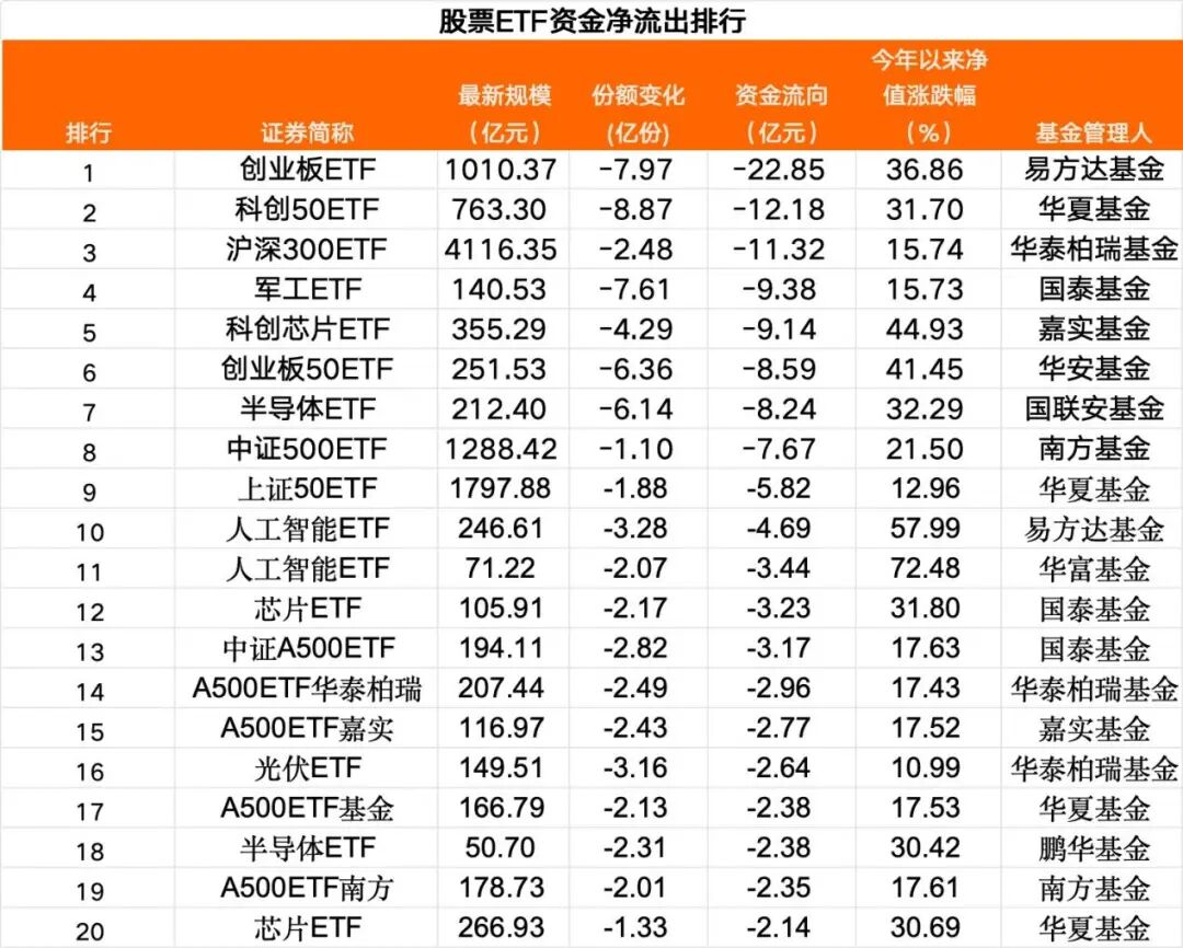 宽基ETF资金净流出居前 9月3日,股票ETF整体资金净流出较大,宽基净流出居前,超过110亿元。 当天,股票ETF中38只净流出资金超过1亿元,科创板、创业板、沪深300、中证A500等宽基ETF以及芯片半导体、人工智能等行业主题ETF“失血”相对靠前。 在净流出前20股票ETF中,2只创业板相关ETF净流出超过30亿元,5只半导体芯片相关ETF净流出超过25亿元,科创板50、沪深300、中证A500等相关ETF资金净流出均超10亿元。 由于前两个交易日保持较多净流入,本周股票ETF仍以资金净流入为主。9月以来,合计净流入资金不到50亿元。 展望后市,易方达基金基金经理李树建表示,在流动性保持合理充裕、政策持续增强资本市场稳定性、新兴产业快速发展的背景下,A股和港股有望为全球投资者提供中长期配置价值。具体来看,创新药、AI、机器人、卫星等多个行业经过快速发展,部分领域已达到全球领先的水平,在国际市场的竞争力显著增强,有望培育新一批代表中国经济高质量发展趋势的优质企业。 东方红资管基金经理苗宇表示,下半年以来,医药和AI表现较好,大逻辑也比较清楚,后续仍然看好这些方向,需要关注业绩兑现度。对整体市场仍比较乐观,看好创新、出海、红利三大方向。