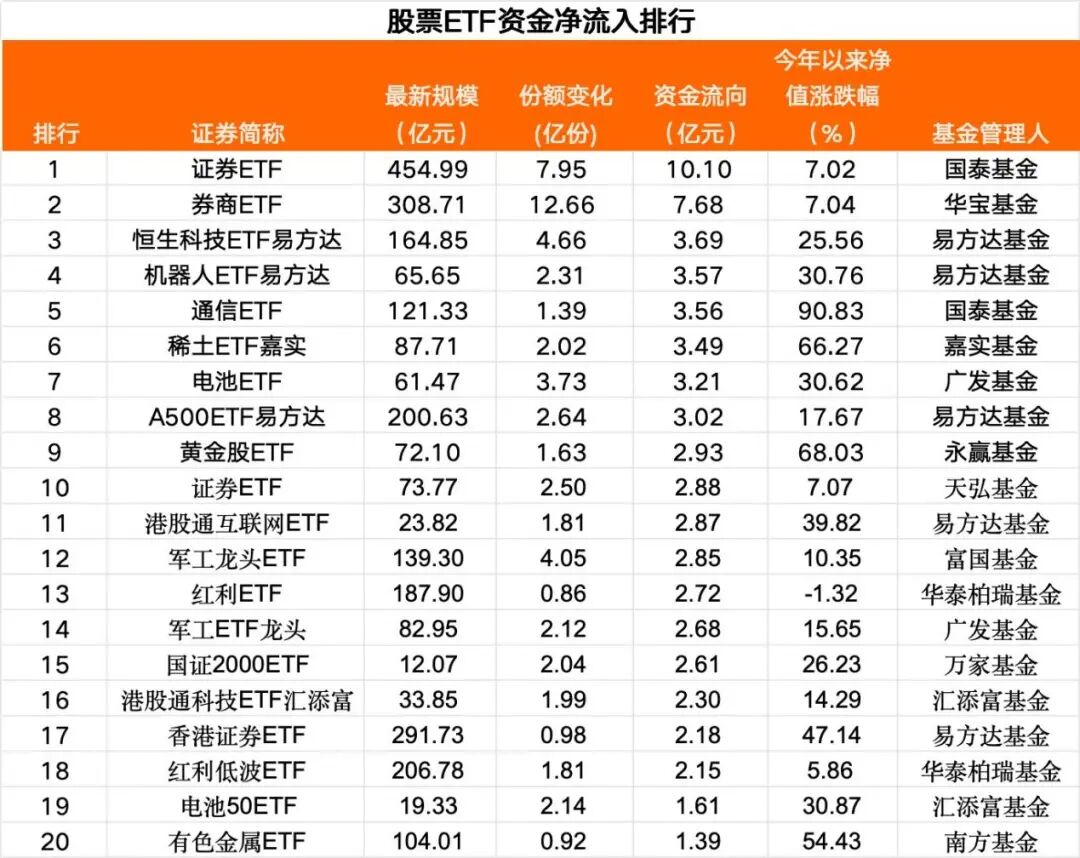9月3日(本周三),A股市场呈现震荡调整态势,沪指全天震荡下行,最终跌超1%,收于3813.56点;两市成交额缩量至2.36万亿元。 股票ETF市场资金流向数据显示,周三ETF出现95亿元资金净流出,证券、港股科技机器人、红利等行业主题ETF净流入居前,科创板、创业板、沪深300、中证A500等宽基ETF以及芯片半导体、人工智能等行业主题ETF“失血”相对靠前。 由于前两个交易日保持较多净流入,本周股票ETF仍以资金净流入为主。9月以来,合计净流入资金不到50亿元。 单日资金净流出95亿元 Wind数据显示,截至8月29日,全市场1195只股票ETF(含跨境ETF)总规模为4.23万亿元。 股票ETF资金流向显示,周三资金以净流出为主。据测算,当日股票ETF净流出资金超95亿元。 从资金净买入排行榜看,当日净流入1亿元以上的股票ETF有28只,行业主题ETF净流入居前。其中,国泰证券ETF、华宝券商ETF、易方达恒盛科技ETF位居前三,资金净流入均超3亿元,国泰证券ETF净流入超过10亿元。 来自易方达基金的数据显示,9月3日,以下方向资金净流入居前,分别为证券(净流入24.2亿元)、港股科技(净流入9.3亿元)、机器人(净流入7.5亿元)、红利(净流入4.8亿元)、港股互联网(净流入4.6亿元)。 另据Wind统计,资金净流入前20股票ETF中,券商相关ETF有4只,港股科技、互联网相关ETF有3只,军工、电池、红利等行业主题ETF各有2只。从5日角度观测,近期资金流入证券公司指数超78亿元,流入恒生科技超60亿元。 头部基金公司中,截至9月3日,易方达基金ETF最新规模7642亿元,旗下恒生科技ETF易方达净流入3.6亿元,机器人ETF易方达净流入3.57亿元,A500ETF易方达净流入3.02亿元,港股通互联网ETF净流入2.87亿元,香港证券ETF净流入2.18亿元。 华夏基金旗下ETF中,9月3日,机器人ETF和恒生科技指数ETF单日净流入居前,分别净流入1.16亿元和0.84亿元,最新规模分别达173.48亿元和389.4亿元,对应跟踪指数近1个月日均成交额分别为16.45亿元和53.4亿元。 在近期震荡市场中,同类产品中规模最大的广发港股创新药ETF表现较为突出,最新规模为215亿元,其自8月29日至9月3日的4个交易日累计涨幅达8.82%,年内涨幅已超115%。国金证券认为,港股创新药ETF为投资者提供了高效参与Biotech赛道的方式,兼具科技与医药双重属性,适合中长期资金配置。