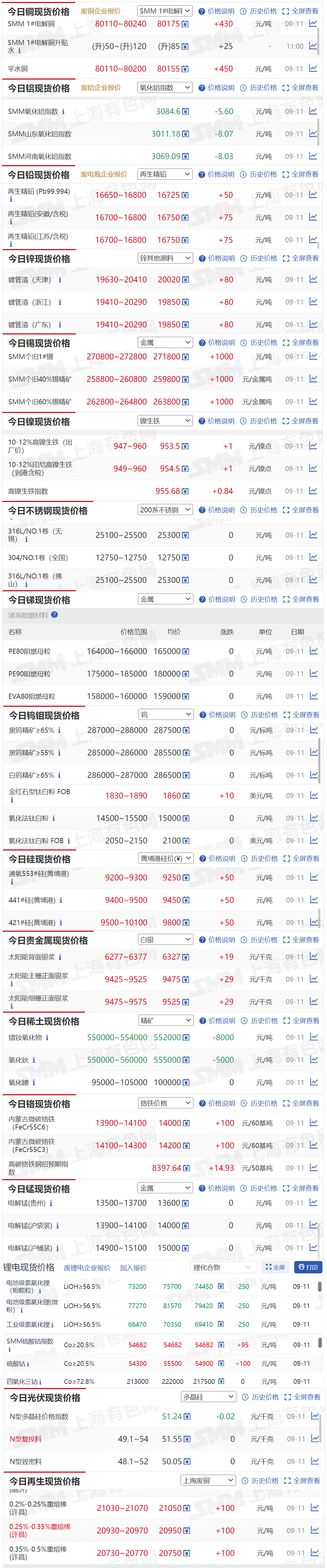 ►基本金属内强外弱 工业硅两连涨 铁矿跌逾1% 欧线集运跌超4%【SMM午评】 ►铜价走高下游消费低迷 现货升水下降【SMM华南铜现货】 ►铜价冲高下游需求惨淡 现货升贴水继续走弱【SMM华北铜现货】 ►9月11日广东铜现货市场各时段升贴水(第四时段10:50)【SMM价格】 ►9月11日上海市场铜现货升贴水(第四时段)【SMM价格】 ►再生铅:炼厂出货积极性较昨日好转 下游企业维持刚需采购 【SMM铅午评】 ►SMM 2025/9/11 国内知名再生铅企业废电瓶采购报价 ►天津锌:盘面回升 天津市场交易清淡【SMM午评】 ►宁波锌:贸易商佛系报价 现货升水持稳【SMM午评】 ►广东锌:锌价重心上行 现货升贴水下降【SMM午评】 ►市场密切关注晚间将发布的美国CPI数据 沪锡午盘保持震荡走势【SMM锡午评】 ►【SMM镍午评】9月11日镍价维持弱势震荡,美国8月PPI意外回落