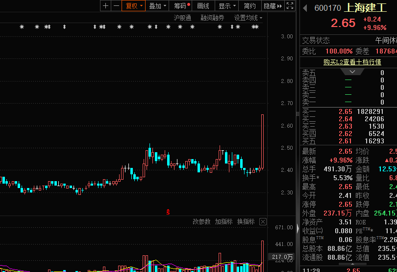 | 三部门公布电力装备行业稳增长工作方案,有序推动一批沿海核电项目核准建设。 9月12日早间,沪指早盘冲高回落,有色、钢铁等周期股集体走强,白银方向领涨,盛达资源、湖南白银涨停,兴业银锡涨超8%,再创历史新高;华菱钢铁涨停,首钢股份、新钢股份等股跟涨;房地产板块盘中拉升,半导体芯片股延续强势。游戏股走低,游族网络跌超5%;玻纤、食品饮料、保险等板块领跌。 上海建工(600170)早盘急速拉升至涨停,目前涨停板上有182.83万手封单,最新股价2.65元/股。