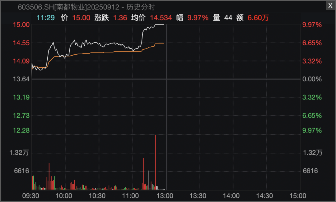在恒大物业大涨带动下,恒生物业服务管理指数大幅高开,盘中一度大涨逾3%,远洋服务、绿城服务、北京北辰实业股份、碧桂园服务等纷纷高开高走。 A股地产服务概念股也跟随走强,板块指数放量大涨逾3%,半日成交超昨日全天成交。新大正开盘仅1分钟就直线涨停,连续第2日封板;南都物业同样强势涨停,创3年多来新高;世联行、特发服务等涨幅居前。