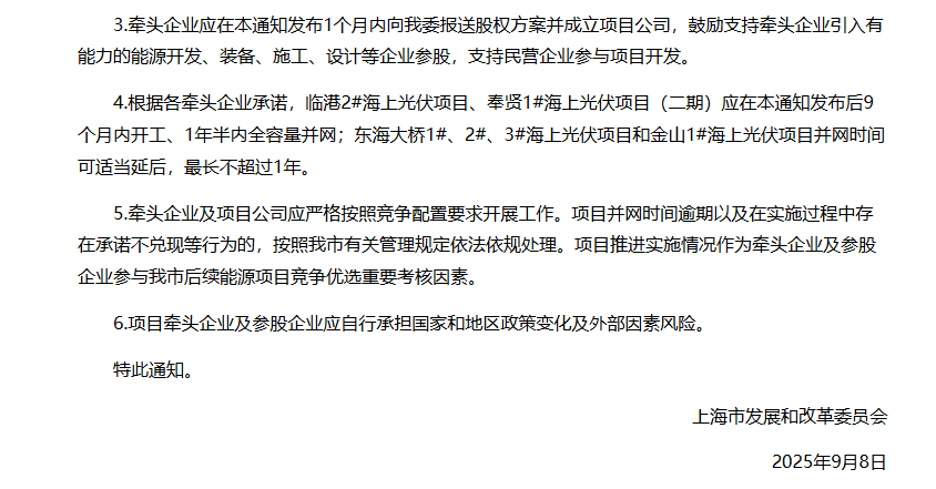 根据之前发布的竞配方案,此次拟竞争配置的“风光同场”海上光伏项目场址为上海市未组织竞争配置的已建、在建海上风电场址,竞配项目共2.7GW,均为光伏项目,与海上风电示范项目同场。 通知明确,申报企业在获得项目开发权后一个月内向市发展改革委报送项目股权方案,牵头企业股比不低于1/2、不高于2/3。支持牵头企业引入有能力的能源开发、装备、施工、设计等企业参股,支持民营企业参与项目开发。 本轮竞争配置项目上网电价由我委组织海上光伏项目自愿参与竞价形成。其中,临港2#海上光伏项目、奉贤1#海上光伏项目(二期)申报机制电量占全年发电量比例上限按90%执行;其他项目申报机制电量比例上限取70%和当年度我市新能源上网电价市场化改革机制相关政策规定上限的低值,具体按照我市新能源增量项目竞价工作方案执行。 文件要求,牵头企业应在本通知发布1个月内向我委报送股权方案并成立项目公司,鼓励支持牵头企业引入有能力的能源开发、装备、施工、设计等企业参股,支持民营企业参与项目开发。 根据各牵头企业承诺,临港2#海上光伏项目、奉贤1#海上光伏项目(二期)应在本通知发布后9个月内开工、1年半内全容量并网;东海大桥1#、2#、3#海上光伏项目和金山1#海上光伏项目并网时间可适当延后,最长不超过1年。牵头企业及项目公司应严格按照竞争配置要求开展工作。项目并网时间逾期以及在实施过程中存在承诺不兑现等行为的,按照我市有关管理规定依法依规处理。项目推进实施情况作为牵头企业及参股企业参与我市后续能源项目竞争优选重要考核因素。 原文如下: