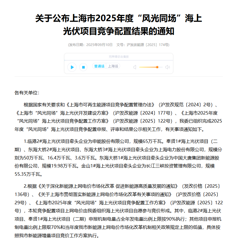 9月10日,上海市发展和改革委员会公布上海市2025年度“风光同场”海上光伏项目竞争配置结果。 据悉,本次海上光伏项目竞配范围为利用上海市海域未组织竞争配置的已建和在建海上风电场址开发的“风光同场”海上光伏项目。 根据公示,申能股份、上海电力、大唐集团、三峡集团6个项目入选,申报总规模210.33万千瓦。