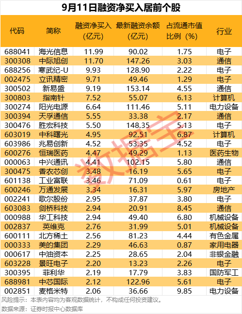 公司拟以发行股份及支付现金的方式购买芯来共创、胡振波、芯来合创等31名交易对方合计持有的芯来科技97.007%股权。同时,上市公司拟向不超过35名特定投资者发行股份募集配套资金。本次交易预计构成重大资产重组。 通过本次交易,公司将进一步完善IP储备并强化在RISC-V领域的布局。芯原已拥有针对异构计算的丰富的处理器IP储备,本次交易将为公司补足优质且具有高速发展前景和广阔应用空间的CPU IP,从而构建全栈式异构计算IP平台,进一步提升公司的竞争力、拓展与现有客户的合作深度、提高客户黏性,以及扩大业务发展空间。 另外,公司还自愿披露了新签订单信息,7月1日至9月11日,公司新签订单12.05亿元,较去年第三季度全期大幅增长85.88%,新签订单已创历史新高,其中AI算力相关的订单占比约64%。除新签订单创历史新高外,公司在手订单持续保持高位,预计将对公司后续经营业绩产生深远的影响,截至2025年第二季度末,公司在手订单金额为30.25亿元,已连续七个季度保持高位,创公司历史新高。 9股获融资净买入超5亿元 截至9月11日,市场融资余额合计2.32万亿元,较前一交易日增加144.13亿元,这已经是融资余额连续5个交易日持续增加。 分行业统计,电子行业融资余额增加最多,较上一日增加52.59亿元;融资余额增加居前的行业还有通信、计算机、电力设备等,融资余额分别增加39.84亿元、29.22亿元、21.36亿元;融资余额减少的行业有12个,银行、医药生物、传媒等行业融资余额减少较多,分别减少5.11亿元、4.96亿元、3.21亿元。 具体到个股,9月11日获融资净买入1亿元以上的有56只,其中9只融资净买入额超5亿元。海光信息融资净买入额居首,当日净买入11.99亿元;其次是中际旭创、寒武纪-U,融资净买入金额分别为11.70亿元、9.93亿元;融资净买入金额居前的还有立讯精密、新易盛、指南针等。