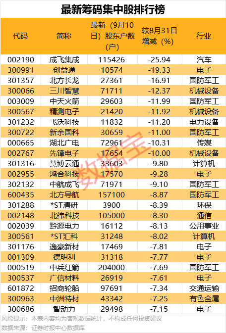 筹码大幅集中,9股股东户数降逾一成 统计显示,共有361只个股公布了9月10日股东户数,与上期(8月31日)相比,股东户数下降的有175只。其中股东户数降幅超一成的有9只。 股东户数降幅最多的是成飞集成,截至9月10日股东户数为115426户,较8月31日环比下降25.94%;其次是创益通,最新股东户数为10574户,环比下降19.33%;北方长龙最新股东户数27361户,环比下降16.91%。