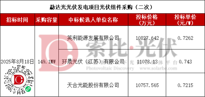 第一中标候选人为英利能源发展有限公司,投标单价0.7262元/W。