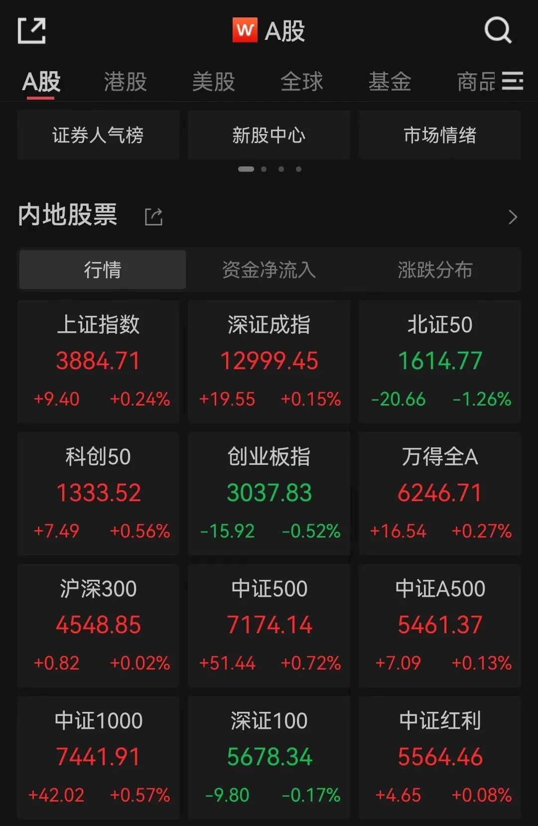 | A股市场今天(9月12日)上午整体涨跌互现,主要指数表现有一定分化,其中科创50指数表现相对较强,中证A500指数盘中创出新高。 A股有色金属板块大涨。白银价格上行,沪银期货突破10000元/千克大关。 港股市场今天上午继续上行,恒生指数盘中再创年内新高。巨星传奇盘中直线拉升,盘中一度涨超20%。 中证A500指数盘中创新高 A股市场今天上午整体涨跌互现,主要指数表现有一定分化。 上证指数震荡反复,盘中一度创出最近10年新高;科创50指数表现较强,盘中涨幅一度超过2%;创业板指数走低,盘中跌幅一度超过1%。