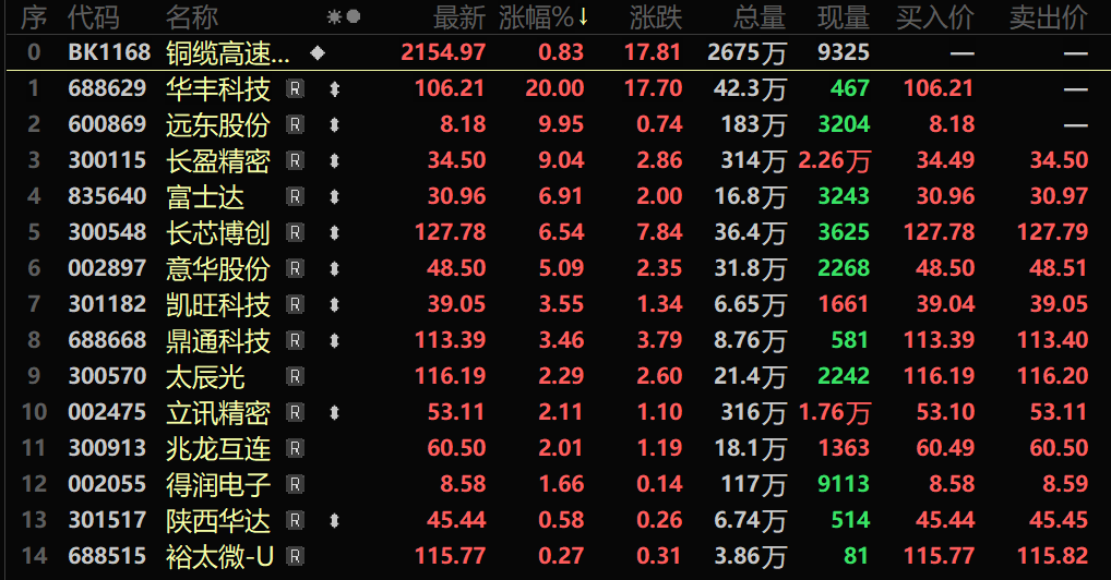 SMM9月18日讯: 随着人工智能、云计算等新兴技术的蓬勃发展,算力硬件需求呈现爆发式增长。数据中心、服务器等高性能计算设备内部高速互联依赖于稳定可靠的连接方案,铜缆高速连接作为关键基础元器件,不可或缺;高速传输技术不断突破,提升了对高速铜缆的需求;部分企业获得了大量订单提振以及部分市场资金的青睐等带动铜缆高速连接概念走强,截至9月18日收盘,铜缆高速连接概念涨0.83%,个股方面:华丰科技、远东股份涨停,长盈精密、富士达、长芯博创、意华股份以及鼎通科技等涨幅居前。