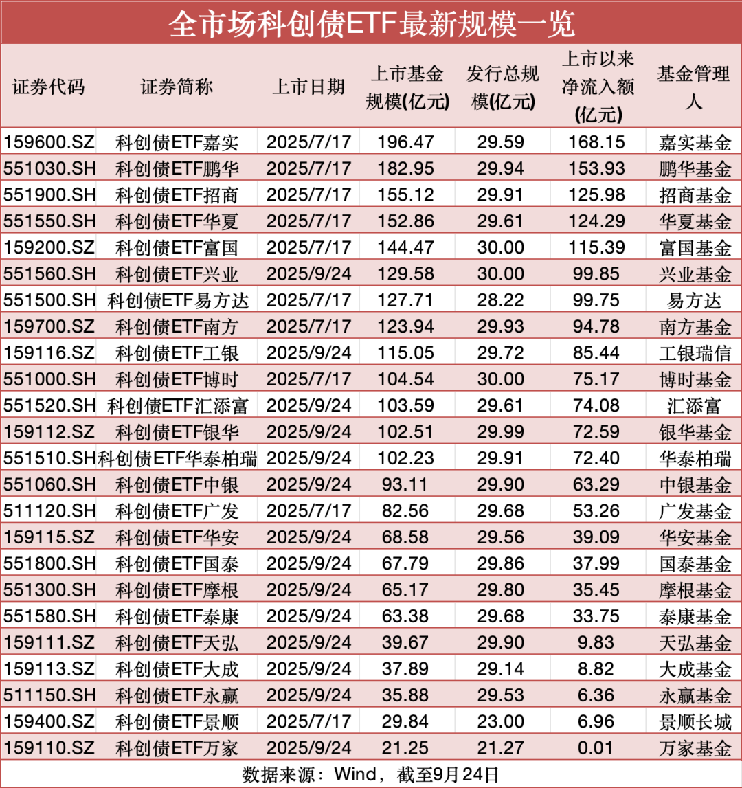 科创债ETF正以闪电速度“吸金”。 仅一天时间,昨日上市的第二批14只科创债ETF,就已诞生5只百亿元级ETF,分别是科创债ETF华泰柏瑞、科创债ETF兴业、科创债ETF工银、科创债ETF汇添富、科创债ETF银华。第二批14只科创债ETF昨日合计“吸金”638.94亿元。 Wind数据显示,截至9月24日,全市场科创债ETF总规模突破2300亿元,全市场债券ETF总规模突破6700亿元。 第二批科创债ETF单日“吸金”超600亿元 随着场内资金不断流入,百亿元级债券ETF阵营正迅速扩容。 9月24日,第二批14只科创债ETF正式上市,仅一天时间,就诞生5只百亿元级ETF。 Wind数据显示,截至9月24日,科创债ETF兴业总规模达到129.58亿元,是第二批科创债ETF中规模最大的一只;科创债ETF工银总规模突破110亿元;此外,科创债ETF汇添富、科创债ETF银华、科创债ETF华泰柏瑞总规模均突破100亿元。