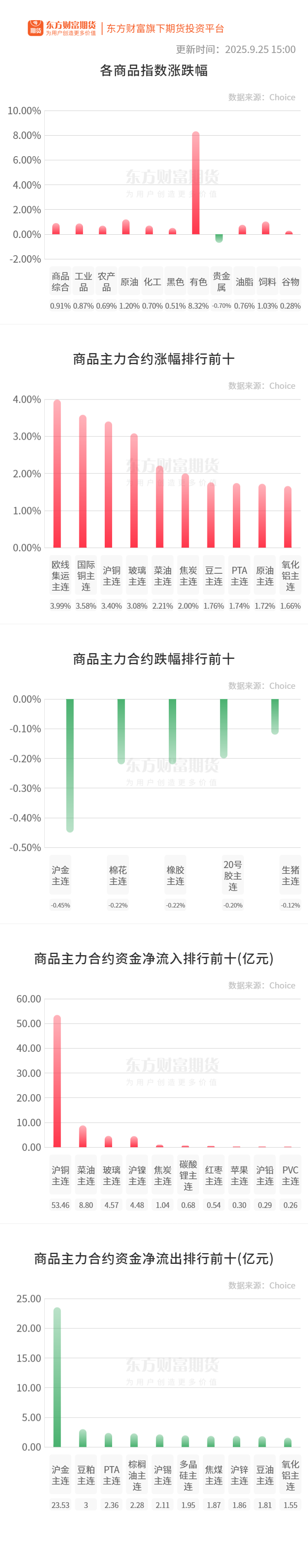 行情纵览![]() 宏观产经新华社:9月25日,2025年全国国庆文化和旅游消费月主场活动在四川省成都市举办,正式启动国庆文旅消费月,于9月下旬至10月下旬开展系列文旅消费活动,激发假日消费活力,满足人民美好生活需要。 每日经济新闻:当地时间9月24日,美国特朗普政府发布正式公告,实施美国与欧盟达成的贸易协议,确认自8月1日起,对欧盟进口汽车及汽车产品征收15%的关税。此外,文件还列出了对某些药物化合物、飞机零部件及其他进口商品的关税豁免。 财联社:央行今日开展4835亿元7天逆回购操作,投标量4835亿元,中标量4835亿元,操作利率为1.40%,与此前持平。 品种资讯黑色系期货 钢材:据Mysteel,截至9月25日当周,螺纹钢产量由降转增,厂库连续三周下降,表需连续二周增加,社库连续二周下降。螺纹产量206.46万吨,较上周增加0.01万吨;螺纹厂库164.41万吨,较上周减少0.66万吨,降幅0.4%;螺纹社库471.89万吨,较上周减少13.32万吨,降幅2.75%;螺纹表需220.44万吨,较上周增加10.41万吨,增幅4.96%。(我的钢铁网) 焦煤:9月25日蒙古国ETT公司炼焦煤进行线上竞拍,1/3焦精煤A12,V37,S0.85,G80,Mt10起拍价90.4美元/吨,挂牌数量3.2万吨全部成交,成交价格100.4美元/吨,较昨日上涨2.5美元/吨,以上价格均不含税。供货地点为甘其毛都口岸海关监管区,供货时间为付款后45天内,最后供应日期为2025年11月9日。(我的钢铁网) 焦炭:邢台市场焦炭价格计划提涨,捣固湿熄焦上调50元/吨、捣固干熄焦上调55元/吨。调整后捣固准一干熄报价1565元/吨,出厂价现金含税,自9月26日0时起执行。(我的钢铁网) 农产品期货 生猪:据农业农村部监测,9月25日“农产品批发价格200指数”为118.78,与昨天持平,“菜篮子”产品批发价格指数为119.70,与昨天持平。截至今日14:00时,全国农产品批发市场猪肉平均价格为19.44元/公斤,比昨天下降0.8%;鸡蛋8.48元/公斤,比昨天下降0.1%。(农业农村部) 棕榈油:马来西亚独立检验机构Amspec表示,马来西亚9月1-25日的棕榈油出口量为1185422吨,上月同期为1065005吨,环比增加11.3%。(新华财经) 有色/贵金属期货 沪铜:9月25日国内市场电解铜现货库存14.56万吨,较18日降1.10万吨,较22日降0.28万吨; 上海库存9.86万吨,较18日降0.11万吨,较22日增0.39万吨; 广东库存1.54万吨,较18日降0.58万吨,较22日降0.21万吨; 江苏库存2.65万吨,较18日降0.27万吨,较22日降0.32万吨。国内电解铜库存继续表现去库,仅上海市场有所增加、广东、江苏市场贡献主要降幅;周内铜价高位运行为主,下游备货需求相对有限;虽国产货源到货依旧较少,但上海市场进口铜仍有到货补充,库存因此有所增加。(我的钢铁网) 因隔夜伦铜暴涨,日内进口比价坍塌,出口窗口虽有打开,但大部分冶炼厂出口计划未定,贸易商询盘居多。同时LME-COMEX远月价差扩大,部分贸易商积极寻找10月到港两牌提单。(SMM) 高盛表示,矿业巨头Freeport McMoRan印尼子公司Grasberg矿山停产意味着对2025年12月伦敦金属交易所(LME)铜价9700美元/吨的预测风险偏向上行,预计铜价将稳定在10200至10500美元/吨区间;对2027年前铜价的长期看涨预测为每吨10750美元。(财联社) 沪锌:截至本周四(9月25日),七地锌锭库存总量为15.04万吨,较9月18日减少0.80万吨,较9月22日减少0.66万吨,国内库存减少。(SMM) 能化期货 烧碱:截至9月25日,全国20万吨及以上固定液碱样本企业厂库库存39.12万吨(湿吨),环比上调3.4%,同比上调26.26%。本周全国液碱样本企业库容比20.78%,环比上涨0.64%;本周西北、华北、华中、华东库容比环比上行,东北、华南、西南区域库存比环比下滑。(隆众资讯) 玻璃:周内玻璃产销前低后高,下半周在消息面提振下,中下游采购订货积极,多地企业发布涨价通知,产销率大幅提升,带动企业库存继续下降。截止9月25日,全国浮法玻璃样本企业总库存5935.5万重箱,环比下降155.3万重箱或2.55%,创1月末以来新低,同比降幅达18.56%,折库存天数25.4天,较上期下降0.6天。分区域看,其中华南地区因广东台风影响出货,企业库存小增,其余地区库存均下降。(隆众资讯) 尿素:尿素前期检修装置的集中复产,本周企业开工率环比大幅提升。尿素企业库存继续上涨,临近国庆,各地尿素工厂陆续启动国庆收单,少数企业因流向问题造成库存上涨,部分企业积极发货去库存,虽然企业库存涨跌不一,但整体库存仍处于上涨趋势。(隆众资讯) 乙二醇:截至9月25日,华东主港地区MEG库存总量40.03万吨,较上周四增加1.66万吨,较本周一降低0.82万吨。详细来看,张家港18.93万吨,太仓9.1万吨,宁波2.8万吨,江阴及常州7.1万吨,上海及常熟2.1万吨。(隆众资讯) 晚间关注20:30 美国:当周首次申请失业金人数 (文章来源:东方财富研究中心) |