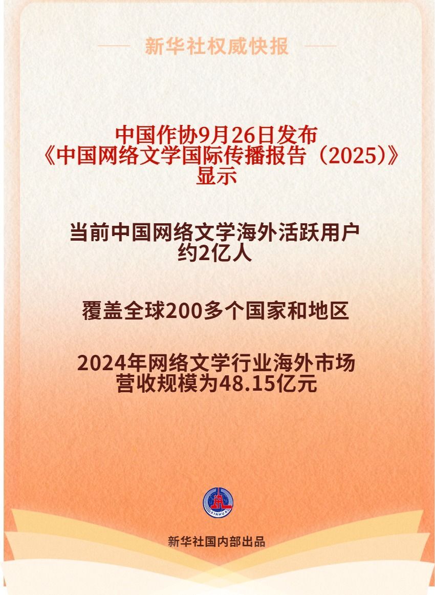 中国作协9月26日在浙江杭州发布的《中国网络文学国际传播报告(2025)》显示