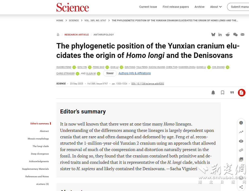 荆楚网(湖北日报网)讯(记者谢颐 通讯员路彩霞)北京时间2025年9月26日凌晨2点,国际权威学术期刊《科学》(Science)发表了题为《“郧县人”头骨的系统发育定位揭示龙人与丹尼索瓦人的起源》的研究论文。该研究由山西大学、中国科学院、云南省文物考古研究所、湖北省文物考古研究院、武汉大学、十堰市博物馆、保利艺术研究院、中国地质大学(武汉)和英国伦敦自然历史博物馆等单位的专家学者合作完成。长江文化研究院特聘研究员冯小波教授为论文第一作者,学术委员会委员方勤研究员等为共同作者。