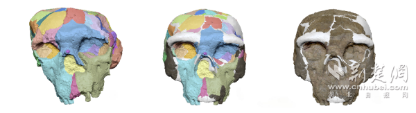 “郧县人2号”头骨复原过程(图片来源:中国科学院官网) 联合科研团队运用高精度CT扫描与结构光表面扫描技术,清晰辨识出“郧县人”2号头骨化石中的裂隙、矿物填充区域及未变形骨片,并基于解剖学与几何形态学标志点,采用创新的数字重建方法,实现了头骨的虚拟精细拼接。研究团队以“郧县人”作为关键校准点,构建了新的人属系统演化树,结合贝叶斯支端定年法与简约性分析,推算了各人类支系的分化时间。