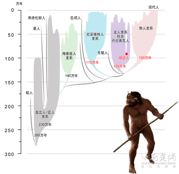 人属系统演化树(图片来源:中国科学院官网) 研究结果显示,智人、龙人与尼安德特人三者之间的分化时间远早于既往认识,“郧县人”不属于直立人,而是与丹尼索瓦人密切相关的龙人支系的早期代表。“郧县人”帮助科学家澄清了100万年至30万年前这段时期的人类演化迷雾,它提醒我们,关于人类的起源,我们不知道的远比已知的要多。