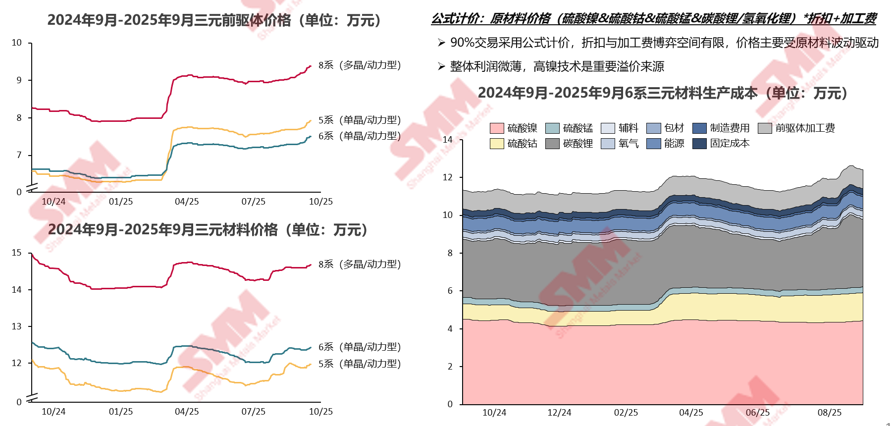 核心趋势:高镍化引领技术方向,产能布局趋向全球化与本土化 系别占比:中高镍占据中国动力市场主流,高镍化仍是全球长期趋势 在中国动力电池市场中,中高镍三元电池占据中国动力电池市场的主流,据SMM了解,中国动力市场,6系NCM占据主导,主要包括两种型号: 1.中镍高电压 2.传统613单晶 •随着大圆柱等新技术发展,9系NCM市场份额逐步扩大 海外动力市场 •8系NCM占据主流 •9系NCM市场份额逐步扩大 •中镍高电压材料预计2027年后增量 小动力市场方面: 电动二轮车&电动工具:当前5、6、8系NCM及NCA都有应用,且正在向高镍化转型;无人机&机器人则以8、9系NCM为主。 消费电子市场: 充电宝:6、8、9系NCM为主;智能家居:5、6、8系NCM都有覆盖 三元材料产能:正极企业加码欧洲 SMM预计,2025年全球三元正极产能约270万吨左右。波兰、匈牙利、摩洛哥等国家均有新建三元正极产能的计划。 SMM预计自2024年到2030年,全球三元正极年产能复合年均增长率在3.6%左右。 三元前驱体产能:全球化扩张与供应链本土化双轮驱动 SMM预计,2025年全球三元前驱体产能有望达到250万吨上下,其中中国三元前驱体产能占比最高,而韩国、法国、摩洛哥和印度尼西亚等国家均有新增三元前驱体产能的计划。三元前驱体产能将呈现全球化扩张与供应链本土化的双轮驱动模式。 三元材料产量:需求增速受限,市场高度集中 三元市场短期增长受限,但仍存在其不可替代性 增长受阻 → •政策退坡致使电动化节奏放缓,全球新能源车销增速下滑 •终端价格竞争激烈,铁锂材料更受中国主机厂青睐 增长驱动 → •低空经济发展与小动力市场高端化推动三元材料需求 •固态/半固态电池等新技术更适配三元正极材料 SMM预计2025年行业排名前十的企业产量占比或高达82%左右,市场高度集中。 关键挑战:成本传导机制刚性,新兴技术成熟尚需周期 价格与成本结构:原材料价格波动刚性传导,企业利润博弈空间有限