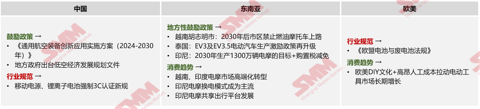 市场现状:终端需求增速放缓,小动力市场快速崛起 动力终端短期走势:中国政策托底,欧洲小幅回暖,美国增长承压 SMM对中国、欧洲以及美国的动力终端的短期走势作出预测: 中国方面,预计2025年下半年中国新能源汽车销量或将持续增长,2026年新能源汽车销量或仍将同比小幅上行。政策面来看,2025年下半年,汽车消费将纳入财政贴息范围,2026年,新能源汽车购置税由免征改为减半,以旧换新政策在2026年将不再延续。 在欧洲市场,预计2025年上半年新能源汽车的销量将保持稳定态势,而到了2026年则有望迎来复苏。这一预测基于两个主要原因:首先,英国出台了新的新能源汽车补贴政策,同时中国的主要汽车制造商也在欧洲增设了生产基地;其次,多款全新的纯电动汽车计划于2026年开始大规模进入市场。这些因素共同作用下,预计将对新能源汽车销售产生积极影响。 美国方面,预计2025年第三季度后,美国新能源汽车需求或将下滑,因大而美法案规定新能源车购置税抵免9月30日后取消。 动力终端长期走势:中国占据增长主力,欧美电动化进程趋缓 SMM预计,2024年到2030年,全球新能源乘用车销量中,中国将占据增长主力,欧美的电动化进程较为缓慢。 中国方面,新能源乘用车行业发展的驱动力在于——《关于进一步构建高质量充电基础设施体系的指导意见》、《汽车行业稳增长工作方案(2025-2026年)》等的实施;但同时也面临新能源车购置税减免将于2027年底退坡、新能源车以旧换新政策2026年不再延续等的阻力。 欧洲方面,新能源汽车市场发展的驱动力在于欧盟拟推动大型企业及租赁公司自2030年起全面采购电动车的决策,但车企对2035年禁燃目标抵制强烈,欧盟将于2026年重启条款复审的情况也是其发展的一大阻力。 在美国,新能源汽车市场面临着诸多挑战。《大而美法案》的实施导致了一系列不利变化,包括终止对新/二手电动车的联邦税收抵免、暂停全国范围内的充电桩建设资金支持、取消加州2035年禁售燃油车的权利,以及不再对未能达到燃油经济性标准的汽车制造商进行罚款等措施。这些政策调整无疑给新能源汽车行业的发展带来了额外的压力。 SMM预计2030年中国新能源乘用车销量或达2000万辆左右,全球渗透率高达79%上下。 动力电芯:三元固守高端性能市场,与铁锂实现应用互补 SMM预计,2025年全球动力电芯产量或将在1300GWh左右。按照不同电芯类型的需求量占比来看,预计自2024年到2030年,磷酸铁锂电芯的需求量将持续攀升,三元电芯的需求占比或逐步收窄。 三元电池凭借着相比于磷酸铁锂电池拥有更高的能量密度、更好的低温性能、更快的充电速度快以及更好的电池一致性等优势,这些优势使其更适用于高端性能市场,与性价比更高的铁锂电池实现应用上的互补。 小动力与消费电子市场:小而美的赛道,大潜力的未来 据SMM预测,后续三元电池在动力领域的应用占比或将逐步下降,在小动力领域的应用占比或将逐渐提升。