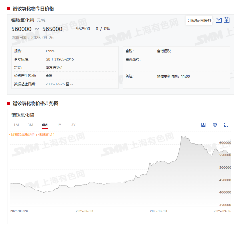 》点击查看SMM稀土现货价格 》订购查看SMM金属现货历史价格走势 9月26日,氧化镨钕的价格为560000~565000元/吨,其均价为562500元/吨,较前一交易日持平。虽然近来稀土价格有所回落,不过562500元/吨这一均价与其2024年12月31日的均价398000元/吨相比,上涨了164500元/吨,今年以来的涨幅为41.33%。 目前氧化物市场趋于稳定,金属市场继续走弱。镨钕市场方面,随着氧化镨钕价格降至相对低位,金属企业的采购补库意愿增强,推动了氧化镨钕市场的交投回暖,整体价格趋于稳定。然而,在金属市场上,磁材大厂对镨钕金属的招标价格低于预期,反映出下游对于高价镨钕金属的需求支撑不足,这导致了镨钕金属价格出现小幅下降。不过,随着磁材大厂招标采购活动增多,预计镨钕金属价格进一步下跌的空间有限。总之,虽然磁材大厂招标采购活动增加,但市场对于高价稀土金属的接受程度仍然较低,从而导致稀土金属市场价格普遍偏弱;相比之下,氧化物市场已经显示出止跌企稳的趋势。预计短期内,随着磁材大厂招标活动增多,稀土价格下行空间有限。 |