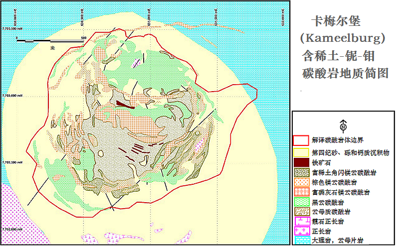 可比加拿大最优矿床 阿尔多罗公司总裁称,镨钕含量超过100万吨,铌(Nb2O5)也超过100万吨,卡梅尔堡应该是具有全球战略意义的矿床,能够与加拿大魁北克省的尼奥北克/圣奥诺雷(Niobec/Saint-Honore)相比,而且没有后者的60-100米厚的盖层。 马格里斯高性能材料(Magris Performance Material)在加拿大的尼奥北克矿山据称能够供应全球10%的铌市场需求。该项目矿石量为7.02亿吨,铌品位0.41%。 尼奥北克是全球仅有的三大铌矿山之一,其他的在巴西。 该矿的稀土资源也被认为是世界最大矿床之一。 研究表明,由于邻近现有大型基础设施,尼奥北克的稀土应该能够低成本生产。 非洲最好的投资目的地? 由于卡梅尔堡碳酸岩大部分出露于地表,阿尔多罗资源公司称该矿开发优势明显,特别是纳米比亚是“非洲矿业投资环境最好的国家”。 采矿业是纳米比亚最大经济支柱,产值占该国GDP的10%。传统上以金刚石开采为主,最近铀、金、铜、锌和关键矿产的开发进一步扩大了采矿业对经济的贡献。 卡梅尔堡矿床沿走向和深部尚未控制,最近的一个孔为迄今最佳见矿。该孔见矿421米,其中包括:从地表开始厚184米,TREO品位2%,铌0.23%,钼0.0395%;厚度140多米,TREO品位0.92%,铌0.32%,钼0.0142%。 第二阶段钻探计划即将开始,将采用大功率钻机,目标深度750米以下,将对最近发现的高品位铌矿段进行验证。 过去钻探深度不到510米。 物探和化探工作也将在下个月开始,目标是东部的奥穆兰戈(Omurango)许可证,阿尔多罗公司称在此发现重稀土矿。 第一阶段稀土选冶试验将在近期开始。 卡梅尔堡位于公路和铁路等基础设施附近,与335公里外的鲸鱼湾(Walvis Bay)港口相连,距离附近的水电线不到7公里。 阿尔多罗以24.2万澳元现金获得了该项目85%的权益,并于2023年向供应商发行50万股股票。 卡梅尔堡在1960年代就被勘探过,地形上是一个高275米的丘陵,直径为1.4公里。从地表来看,整个山都是矿体。 |