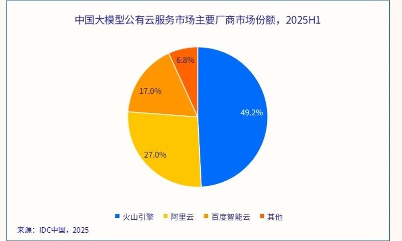 火山引擎已不可小觑。 近日,国际数据公司(IDC)发布《中国大模型公有云服务市场分析2025H1》报告,揭示中国大模型公有云服务市场格局生变。 报告显示,2025年上半年,中国公有云上大模型调用量达536.7万亿Tokens(词元,模型处理文本、图像等数据的最小单元),其中字节跳动旗下火山引擎以49.2%的市场份额位居第一,阿里巴巴(09988.HK)旗下阿里云以27%的份额位列第二,百度(09888.HK)智能云占17%排第三。 ![]() 这一数据与Omdia早前发布的AI云市场报告形成对比,2025年上半年,中国AI云市场规模达223亿元,2025年预计增长148%,到2030年将达1930亿元规模;市场份额上,阿里云占比35.8%位列第一,火山引擎占比14.8%,华为云占比13.1%,腾讯云占比7%,百度云占比6.1%,前五名总和超整个市场的75%。 而IDC按其他口径统计的不同报告中,火山引擎和阿里云均在前列,而这恰是中国云市场双雄争霸的新局面。阿里云凭借历史积累在综合收入上领先,而火山引擎作为新兴势力,在MaaS(大模型即服务)这一关键细分赛道实现弯道超车。 MaaS成为AI云竞争新高地 IDC的大模型公有云服务市场报告,限定统计口径为“各大云厂商对外部客户提供的大模型公有云服务调用量”,不包含自有业务调用。 中国公有云上大模型2025年上半年536.7万亿Tokens的调用量,较2024年全年114万亿Tokens调用量增长近400%,印证火山引擎押注的MaaS商业模式已跑通。市场快速增长背后,是多模态和深度推理大模型正在成为主要驱动力。 多模态基础模型优势显著,可提供更丰富的功能,今年以来各大头部云厂商都在发力语音、图像、视频等多模态领域的模型迭代。而火山引擎在多模态领域表现突出。 2025年,火山引擎相继推出豆包大模型1.6、豆包·视频生成模型Seedance pro、豆包·实时语音模型、豆包·图像创作模型Seedream 4.0等。截至2025年9月,Seedream 4.0在国际权威评测平台LMArena和Artificial Analysis的文生图榜单中登顶,超越谷歌(GOOG.O)的Gemini 2.5 Flash。 Tokens调用量快速增长之时,AI工具的Tokens调用量也在快速增长。今年6月,火山引擎在Force原动力大会上透露称,AI工具的Tokens调用量5个月增长了4.4倍,其中AI搜索增长10倍,AI编程增长8.4倍;截至2025年5月,豆包大模型日均Tokens调用量16.4万亿,相比2024年5月的1200亿增长137倍。据此计算,豆包大模型当时的月均Tokens调用量超过500万亿,同样超过谷歌的月均Tokens调用量480万亿。 除此之外,多模态模型的迭代还进一步加速AI应用落地,如在K12(基础教育阶段)在线教育、智能巡检等场景,视觉理解模型的能力提升带动K12在线教育的Tokens调用量5个月增长12倍,在智能巡检等场景也达到日均百亿级的Tokens调用量。 但与此同时,阿里云在整体AI云市场仍具优势,但对于火山引擎在MaaS上的后发优势,令阿里云倍感紧迫。9月24日,阿里云在2025云栖大会上宣布,其新定位为“全球领先的全栈人工智能服务商”,其专有云飞天企业版升级为涵盖IaaS(基础设施即服务)、PaaS(平台即服务)到MaaS的全栈AI平台。 后发之秀 火山引擎的领先并非偶然。 2024年5月火山引擎推出豆包大模型调用服务之前,中国MaaS仍处于混沌期。早期中国头部云厂商MaaS业务营收普遍仅亿元级,业务优先级相对有限。IDC报告的增长率在2024年6月前都还只是一片空白。但火山引擎自入局云服务起,便将MaaS置于战略核心。 这一布局也与火山晚同行进场多年的现实密切相关,传统云服务路径难实现追赶,倒逼其寻求差异化突破。火山引擎总裁谭待曾向《晚点》提及,2020年入局初期,管理层要求其预判2030年云市场形态,其最终锁定“AI”,这一判断也让火山引擎在大模型浪潮中,精准锚定MaaS赛道,形成如今的优势。 而Tokens调用量这一指标,恰好能反映大模型在实际应用中的渗透率,也被视为AI产业落地的“水温计”。字节跳动内部认为,Tokens调用量是大模型的实际负载,更能反映产业落地的真实水温。 与传统云厂商关注GPU算力规模与营收规模不同,火山引擎更优先关注Tokens调用量这一指标。这种战略选择源于其对AI云未来的判断。谭待也曾表示,“大的使用量,才能打磨出好模型,也能大幅降低模型推理的单位成本。” 同样,在技术层面,火山引擎通过模型和基础设施的共同优化实现领先。其MaaS平台火山方舟在吞吐、并发、首字延迟、平均延迟、成本优化等客户可感知指标上行业领先。在C端需求的推动下,火山引擎还推出AI云原生架构,帮助开发者屏蔽底层硬件差异,直接获得高质量、低成本Tokens。基础设施方面,TensorChord评测显示,火山引擎吞吐效率更高,每秒Token输出量甚至是一些厂商的2.6倍。 技术优势下,火山引擎的合作伙伴也在不断扩大。 目前,在手机厂商中,OPPO、vivo、小米(01810.HK)、荣耀、三星(SSNLF)和传音(688036.SH)等企业均为火山引擎的客户;在汽车行业中,火山引擎及豆包大模型覆盖智能座舱、营销等多个场景,已服务BBA(奔驰、宝马、奥迪)、特斯拉(TSLA.O)和蔚来(09866.HK)等多数主流车企的AI升级。 金融领域中,火山引擎已服务华泰证券(601688.SH)、国信证券(002736.SZ)、招商银行(600036.SH)、浦发银行(600000.SH)等主流券商和基金公司及重要银行。在教育行业,火山引擎与超五成985高校达成合作。这种行业覆盖广度为火山引擎的Tokens调用量增长奠定基础。 IDC报告显示,2024年全年火山引擎在MaaS市场份额为46.4%,2025年上半年进一步扩大至49.2%,已近半壁江山;而阿里云份额从约19.3%增至27%,虽有