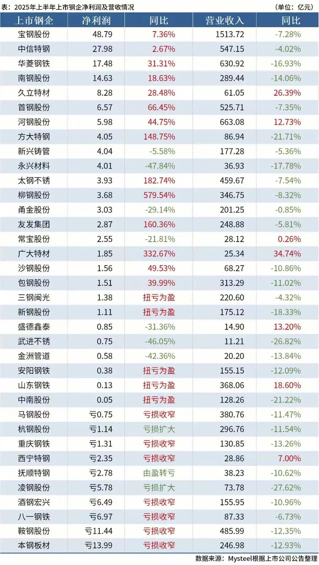 在钢铁行业整体下行的背景下,部分钢铁企业率先迎来复苏。10月10日,山东钢铁发布的业绩预告显示,预计2025年前三季度经营业绩持续向好,盈利能力显著提升,实现利润总额6.32亿元左右,同比增长约21.96亿元;实现归属于上市公司股东的净利润约1.40亿元,同比增长约15.91亿元;扣除非经常性损益的净利润1.38亿元左右,同比增长约16.13亿元。 今年以来,山东钢铁止亏增盈成效显著,其半年报显示,尽管上半年实现营业收入368.06亿元,同比下降18.60%,但毛利率提升至6.02%,同比增加4.15个百分点,实现归母净利润1252.58万元,扭亏为盈。 钢企盈利状况改善,并非山东钢铁一家。期货日报记者梳理上市钢企半年报发现,今年以来,我国钢铁行业供需矛盾有所缓和,钢材出口继续强劲增长,上半年钢铁行业盈利能力整体回升,多家上市公司扭亏为盈或大幅减亏,如柳钢股份、安阳钢铁、新钢股份、中信特钢等。 ![]() 市场人士认为,上述现象是钢企成本降低与风险管理共同作用的结果。当下,利用期货工具避险和降本增效是钢企度过“寒冬”的共同选择。 营收普降,利润反增 记者注意到,今年上半年,虽然大部分钢企营收下降,但净利润却扭亏为盈。据中钢协数据,上半年重点统计钢铁企业营业收入同比下降5.79%,利润总额同比增长63.26%。 “今年上半年,上市钢企呈现‘利润端头部集中、成本红利主导’的特点。宝钢、中信特钢、华菱钢铁合计占据行业超80%的利润;华菱钢铁等企业的汽车钢、电工钢等高附加值钢材占比提高,其溢价能力对冲了普钢价格下跌的影响,并给上市钢企带来了更高的利润。此外,上半年焦煤价格大幅下跌,导致焦炭等炉料价格走低,压低了吨钢成本,也导致上市钢企利润大幅好转。”新湖期货副总经理李强告诉记者。 上市钢企营收下降,原因在于钢价下跌,但不同钢材品种受内需、进出口市场变化影响而有所不同。数据显示,上半年,中国钢材价格指数(CSPI)下跌7.09%。以上海市场价格为例,上半年现货主流规格螺纹钢、热卷、中板、冷轧及带钢价格的下跌幅度分别为7.92%、5.85%、3.24%、17.03%和7.37%。 李强介绍,上半年上市钢企呈现“利润修复、营收疲软”的分化局面:36家上市钢企合计净利润为115.02亿元,其中26家实现盈利,但多数企业营收同比下滑,主要原因是原料降价幅度远大于成品钢材价格的跌幅,为上市钢企盈利改善创造了条件。