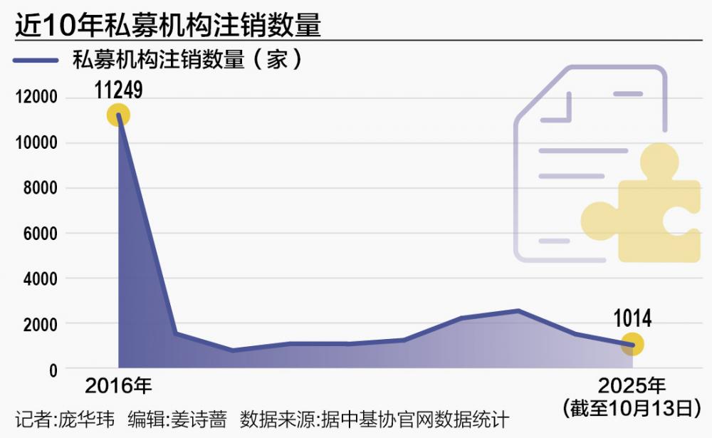 两轮注销潮 近10年来,私募基金行业加速出清。 目前来自中国证券投资基金业协会(以下简称“中基协”)的最新数据显示,截至2025年8月末,存续私募基金管理人19614家。其中,私募证券投资基金管理人7684家;私募股权、创业投资基金管理人11740家;私募资产配置类基金管理人6家;其他私募投资基金管理人184家。 事实上,近10年私募基金管理人的数量在持续下降,这与基金行业的注销潮息息相关。 据中基协官网数据统计,截至10月13日,年内已注销私募基金管理人1014家,较去年同期的1297家,减少283家,降幅约22%。其中,“主动注销”“协会注销”“12个月无在管注销”以及“依公告注销”4种类型注销数量分别为486家、454家、71家和3家。 而9月下旬,在国新办举行的“高质量完成‘十四五’规划”系列主题新闻发布会上,中国证监会主席吴清介绍,“私募基金风险整治扎实推进,约7000家僵尸机构完成出清,‘伪私募’等增量风险基本得到遏制。” 最新数据显示,截至2025年10月13日,自2016年以来的近10年间,私募机构注销数量高达24171家。 回顾私募机构的发展,其经历了两轮注销潮,最早一轮始于2016年。 据中基协数据统计,2015年基金管理人年度注销数量仅为51家,但一年后的2016年狂飙至11249家,暴增220倍。 其中最直接的原因是“空壳私募”的专项清理。 2016年2月5日,基金业协会发布《关于进一步规范私募基金管理人登记若干事项的公告》(俗称“二五公告”),它扔下了一枚“重磅炸弹”:已登记但尚未备案首只私募基金产品的私募基金管理人(即“空壳私募”),必须在2016年8月1日前备案首只产品,否则将被注销管理人登记。 在“二五公告”发布前,已登记的私募机构有约2.5万家,其中超过1.2万家是未备案产品的“空壳机构”。这些机构很多只是为了持有一个金融牌照,并无实际业务。 结果是截至2016年8月1日大限,由于绝大部分空壳机构无法或无意备案产品,基金业协会一次性公告注销了超过7800家私募机构。这一举措直接导致了2016年注销数据的暴增。 随后,私募机构注销数量逐步回落。基本在每年1000余家左右徘徊:2017年为1524家,2018年为772家,2019年为1072家,2020年为1057家,2021年为1234家。 新一轮私募机构注销潮则自2022年开始。 2022年注销2210家,同比大增79%;2023年,私募机构新一轮注销达到峰值,全年注销2537家,同比增加15%。 此后私募机构注销再降速。2024年为1502家,2025年(截至10月13日)为1014家。 “新一轮出清浪潮中,首当其冲的是抗风险能力较弱的中小私募,以及深受IPO退出渠道收窄困扰的股权类机构。甚至部分背靠产业或国资的‘实力派’也未能幸免,凸显了行业困境的普遍性与深度。”一位私募行业资深人士介绍。 与2016年“政策突袭式”的清理不同,近几年私募机构的注销潮是监管政策持续发力、市场波动共同作用的结果。 新一轮私募机构注销潮背后最大原因是监管持续“扶优限劣”,私募合规成本与生存门槛急剧抬高,监管层通过一系列规则,实质性地将私募(尤其是证券私募)的门槛提升到了“类公募”水平。 2023年5月1日,《私募投资基金登记备案办法》及配套指引正式实施。这份被称为“私募史上最严新规”的文件正式生效。它从资本金、人员、制度、场所等方面全面提高了对私募机构的要求。特别是针对投资门槛提升,私募证券产品的初始募集规模大幅提升至1000万元。 “私募产品门槛提升到最低1000万元,且每个产品必须保持全年平均资产1000万元以上。相当于是‘小公募’,门槛相比之前的100万元提升了10倍。这不仅是数字的十倍增长,更是对私募机构募资能力、品牌信誉和持续运营实力的终极考验,直接将大量‘草台班子’拒之门外。”对此,一位私募人士表示。 新一轮注销潮的三大推手 2022年以来,私募机构处于“常态化出清”状态,市场的“冰河期”、行业的“自我净化”和监管的“高压线”成为新一轮注销潮的三大推手。 一位股权私募基金董事长表示,“此轮注销潮中,股权私募的退出压力显著高于证券类同行。主要困境是受IPO节奏放缓、撤材料增多影响,项目退出难,超额分成无法实现。同时,发行5年以上锁定期基金极为困难,生存压力巨大。” 尽管证券类基金在流动性管理上具备相对优势,但其同样面临严峻考验。 一位私募证券机构人士透露:“2022至2024年间,市场低迷与业绩下滑形成了负向循环。管理费收入随规模萎缩而锐减,业绩报酬更是无从谈起。在新发基金举步维艰的同时,存量产品还面临持续的赎回压力,许多机构最终因规模跌破清盘线或无法覆盖运营成本而退出市场。” 同时,行业运营成本的攀升进一步加剧了生存压力。据私募人士介绍,在当前严监管下,维持一个私募牌照的成本(人力、场地、合规、审计等)每年要支出100万元至几百万元。 “若连续三年处于净消耗状态,实缴一千万的注册资金就花光了。”上述私募人士说。 对于那些本就业务清淡、只想“持牌观望”的机构来说,继续保留牌照已不再经济,因此大量小私募选择主动注销。 另一方面,近几年监管层对违规行为的查处力度加大,一批失联机构、“伪私募”、“乱私募”等存在问题的机构被基金业协会强制注销。 事实上,与2016年相比,2023年的出清不再是政策引发的“突发性地震”,而更像是一场持续已久的“监管、市场、行业”三重压力造成的“严酷气候”下的自然淘汰