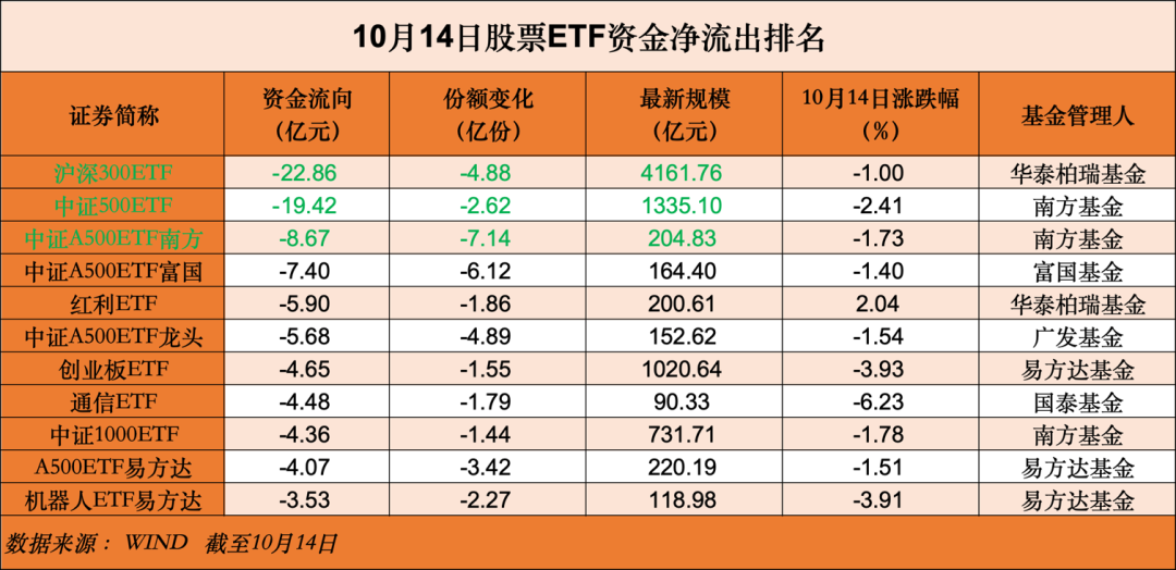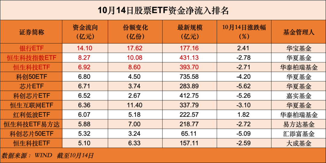 10月14日,A股三大指数全线收跌,截至收盘,沪指跌0.62%,深成指跌2.54%,创业板指跌3.99%。在市场出现大幅震荡之时,资金选择借道股票ETF大举加仓! 当日资金净流入合计达到103.79亿元。半导体、科创板50ETF、恒生科技、银行ETF纷纷成为“吸金”主力;而通信、中证1000ETF成为“失血”大户。 宽基和港股市场ETF获大举加仓 Wind数据显示,截至10月14日,全市场1157只股票ETF(含跨境ETF)总规模达4.48万亿元。在10月14日股市回调行情下,按照区间成交均价测算,股票ETF整体净流入资金为103.79亿元。 从大类型来看,昨日行业主题ETF与港股市场ETF净流入居前,分别达119.63亿元与62.06亿元。 半导体相关产品“吸金”最为明显。昨日芯片半导体板块遭遇重挫,半导体指数大跌4.46%,资金选择借道ETF“抄底”。其中,华夏基金旗下的华夏国证半导体芯片ETF单日净流入达到6.71亿元,嘉实基金旗下嘉实上证科创板芯片ETF单日净流入达6.57亿元,居股票ETF资金净流入排行榜前列。 恒生科技相关产品净流入同样居前。具体到指数维度,10月14日跟踪恒生科技指数的ETF产品资金净流入合计达32.23亿元。其中华夏恒生科技ETF单日净买入8.27亿元,最新规模达431.13亿元; 恒生科技ETF易方达净流入5.88亿元。从5日角度观测,近期资金流入恒生科技指数超过92亿元。 科创板50指数昨日跌幅达4.26%,但资金借道ETF净流入达17亿元。其中,易方达基金旗下科创板50ETF净流入3.7亿元,最新规模约为740亿元,位居同类产品第一。 华夏上证科创板50ETF昨日获资金净流入6.8亿元,最新规模约为735.58亿元。 从头部机构情况看,易方达基金ETF方面,旗下人工智能ETF净流入2.1亿元,最新规模为235亿元,位居同类产品第一;科创200ETF易方达净流入2.0亿元;证券保险ETF净流入1.1亿元。易方达基金ETF最新规模为8027.0亿元,2025年以来规模增加2020.5亿元,其中净流入406.6亿元,净值增加1613.9亿元。 华夏基金ETF方面,上一交易日,芯片ETF和恒生互联网ETF分别净流入6.52亿元和6.36亿元,科创半导体ETF净流入4.68亿元,黄金ETF华夏和港股央企红利ETF净流入超2亿元。 宽基ETF单日净流出居前 昨日,宽基ETF净流出居前,达67.02亿元;规模变化方面,宽基ETF规模下降524.83亿元。 其中,中证A500ETF单日净流出居前,达29.53亿元;沪深300ETF净流出26.9亿元、中证500ETF净流出20.6亿元、中证1000ETF净流出6.7亿元。 除上述宽基ETF外,资金流出居前的细分行业主题ETF还包括通信ETF。 |