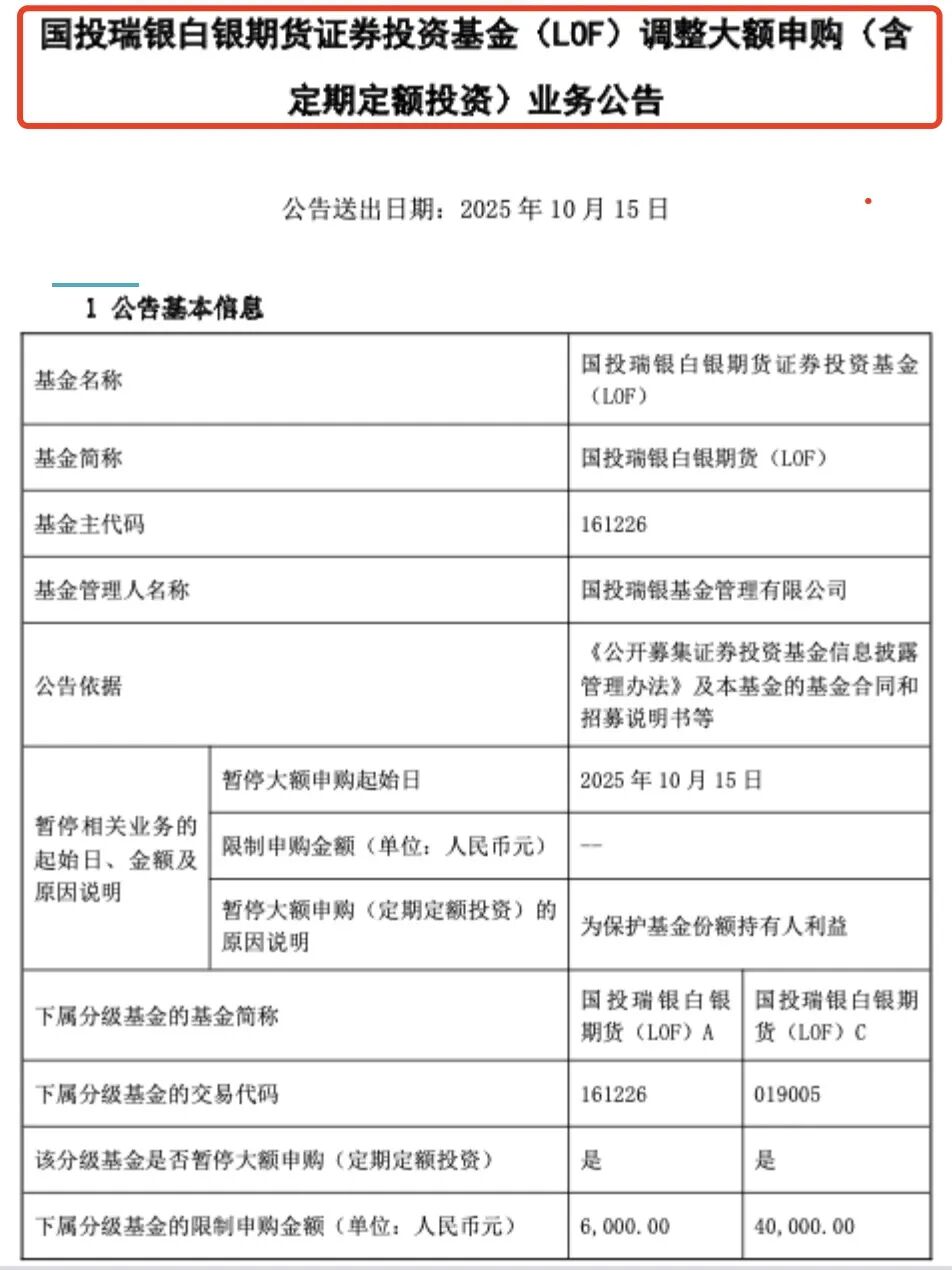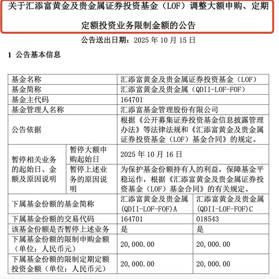 近期,黄金、白银等贵金属迎来新一轮“狂飙突进”行情,COMEX黄金历史上首次突破4000美元/盎司,COMEX白银也站上50美元/盎司关口,价格迭创新高之际,多只相关主题基金出手限购,最低限制金额已在万元以下。 多只贵金属主题基金大额限购 黄金、白银价格迭创新高之际,相关主题基金接连出手限购。 10月15日,汇添富基金发布公告称,为保护基金份额持有人的利益,保障基金平稳运作,根据有关规定,汇添富黄金及贵金属(QDII-LOF-FOF)自2025年10 月16日起,汇添富黄金及贵金属(QDII-LOF-FOF)A、C份额调整大额申购、大额定期定额投资业务限制金额,单日单个基金账户单笔或多笔累计申购、定期定额投资的金额不应超过20000元人民币(含20000元)。 就在上月,汇添富基金刚刚公告,自2025年9月2日起汇添富黄金及贵金属(QDII-LOF-FOF)A、C份额限制大额申购、大额定期定额投资业务,限制金额为50000元。 同日,国投瑞银基金也发布公告称,为保护基金份额持有人利益,自2025年10月15日起,限制国投白银A类、C类基金份额的定期定额投资金额分别为6000元及40000元。 此前公告显示,自2024年6月11日起,A类基金份额申购和定期定额投资限额由2万元降至1万元,C类基金份额申购和定投限额从50万元降至10万元。2024年5月23日,公司首次对C类基金份额实施50万元限购。 黄金主题基金年内表现抢眼 今年以来,受多重因素推动,黄金、白银等贵金属表现强劲,其中,黄金现货年内涨幅接近60%,一度突破每盎司4200美元大关,银现价格年内涨幅超80%,突破每盎司52美元关口,双双刷新历史纪录。 贵金属主题基金年内净值增长率也水涨船高。截至目前,商品ETF中,黄金ETF年内收益均超50%,黄金或贵金属类QDII年内收益也普遍在50%上下。 以汇添富黄金及贵金属(QDII-LOF-FOF)为例,截至10月13日,该基金今年以来累计收益达到52.79%,截至10月14日,国投白银LOF今年以来累计收益达到51.78%。 值得一提的是,截至10月14日,黄金主题ETF规模一举突破2000亿元大关,5只黄金主题ETF规模超百亿元,华安黄金ETF遥遥领先,最新规模接近745亿元,博时、国泰、易方达旗下黄金ETF规模也较大。黄金股ETF中,永赢黄金股ETF也已是百亿元级单品。 在业内看来,本轮金价的飙升并非偶然,而是多重因素叠加下的派生结果。如美国政府停摆风险与债务担忧、美联储降息预期升温、欧日政坛变数引发避险情绪、资金持续涌入黄金ETF等。除了短期的催化因素,支撑黄金长期走强的核心逻辑如全球央行持续增持、去美元化浪潮下的战略选择等也为金价提供了坚实的中长期支撑。 不过,也有机构提醒,金价在快速拉升后,技术上可能面临超买,短期可能出现高位震荡甚至回调。美联储降息节奏、美国债务上限谈判结果等都可能引发金价的剧烈波动。 |