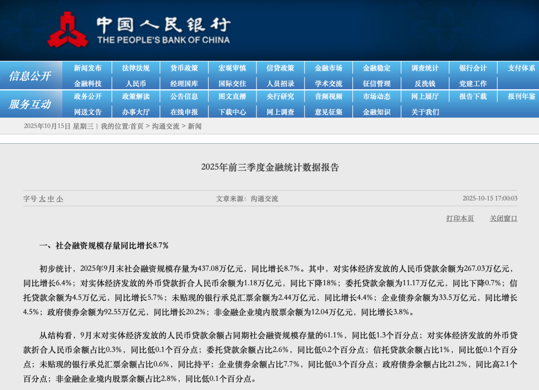 中国人民银行10月15日发布的前三季度金融统计数据报告显示,初步统计,今年前三季度,社会融资规模增量累计突破30万亿元,达到30.09万亿元,比上年同期多4.42万亿元;人民币贷款增加14.75万亿元,人民币存款增加22.71万亿元。 作为衡量金融总量的核心指标——社融增速、广义货币(M2)增速延续高位,表明货币金融持续为经济回升向好创造适宜的环境。9月末,社融存量增速同比增长8.7%,比上年同期高0.7个百分点;广义货币(M2)增速同比增长8.4%,比上年同期高1.5个百分点。 单从9月数据看,当月社融增量、新增人民币贷款表现较为平稳。值得注意的是,作为反映资金活化程度的狭义货币(M1)增速近几个月回升态势明显,9月末升至7.2%,比今年2月末的年内低点大幅提升了7.1个百分点。市场人士分析认为,今年以来M1、M2“剪刀差”明显收敛,反映出企业生产经营活跃度提升、个人投资消费需求回暖等积极信号。 中国人民银行此次将原有的三篇新闻稿《金融统计数据报告》《社会融资规模存量统计数据报告》《社会融资规模增量统计数据报告》合并为一篇《金融统计数据报告》。同时,为保证各方面获取金融统计数据的全面性,此次调整对原有三篇数据报告内容不做删减,仅对内容进行合并。 “政府债+企业债”贡献超四成新增社融 今年以来,政府债券发行提速、企业发债和股权融资渠道更加畅通,直接融资对社会融资规模的拉动作用明显;其中,政府债券对社会融资规模发挥了主要支撑作用。 前三季度,政府债券净融资11.46万亿元,同比多4.28万亿元。同时,受益于政策端对科创债、民企债的支持力度加大,叠加发债利率处于低位,企业发债融资增多,净融资规模达1.57万亿元。受此影响,前三季度,政府和企业债券净融资占比升至43%。 业内专家认为,近年来随着直接融资加快发展,单一的贷款指标越来越难以完整反映金融支持实体经济的成效。今年前三季度,人民币贷款在社融规模增量中的占比降至48%,超过一半的新增社融由其他更为丰富、多元化的融资渠道提供。 “平均来看,债券在银行资产中占比25%左右,全市场约七成政府债券和两成公司信用类债券由银行持有。银行不仅在信贷投放中发挥主力军作用,也是债券投资的主要参与方。”上述专家称,再考虑到更多参与股权市场的券商、基金等各类非银机构,加总来看金融体系对实体经济的支持远不限于贷款这个单一渠道,宜更多观察社融等更全面的统计指标来看待金融支持力度。 信贷增长保持平稳 尽管9月末新增人民币贷款增速降至6.6%,但根据估算,还原地方专项债置换影响后增速在7.7%左右,9月单月新增人民币贷款近1.29万亿元。 9月重点行业扩张和消费贷贴息政策落地等因素为信贷增长创造了有利条件。其中,9月,个人消费贷贴息和服务业经营主体贷款贴息政策开始实施,利息成本下降推动居民信贷需求有所回升。企业贷款保持良好增势,装备制造业、高技术制造业等重点行业维持高景气度,企业融资需求有效释放。 前三季度,信贷结构持续优化。普惠小微贷款余额为36.09万亿元,同比增长12.2%,制造业中长期贷款余额为15.02万亿元,同比增长8.2%,以上贷款增速均高于同期各项贷款增速。 贷款规模在保持合理增长的同时,贷款利率保持低位水平。9月份企业新发放贷款(本外币)加权平均利率约为3.1%,比上年同期低约40个基点;个人住房新发放贷款(本外币)加权平均利率约为3.1%,比上年同期低约25个基点。 业内专家认为,当前,宏观经济总体仍处于需求不足的状态,低通胀、低利率是基本特征。与政府部门相比,私营部门对利率更加敏感。未来金融对实体经济的影响将主要通过利率路径,要更加关注利率含义,把握好量价协同以及贷款、债券、理财等不同市场利率之间的协同,有效发挥利率调控机制的作用,更好激发企业投资和居民消费意愿,提振实体经济有效需求。 M1增速继续提升 专家释疑居民存款“搬家” 9月末,M1同比增长7.2%,增速比上月末大幅提升1.2个百分点,比今年2月末的年内低点(0.1%)提升了7.1个百分点。 M1是当期经济活动的反应,近几个月,M1增速持续回升,除去年同期低基数影响外,也与企业和居民定期存款活化有关。今年以来,M1、M2“剪刀差”明显收敛,9月“剪刀差”进一步收窄至1.2个百分点,反映出企业生产经营活跃度提升、个人投资消费需求回暖等积极信号。 今年新修订后的M1统计口径中包括单位活期存款与个人活期存款。在近期资本市场回暖与利率下行的背景下,不少市场机构将非银机构存款与居民部门存款之间的增减变化,视同居民存款“搬家”到股市。不过,上述观点并不准确,不同部门的存款变化并不必然影响股市变化。 在业内专家看来,今年以来,非银行金融机构存款增长较快,主要与非银存款定期化、持有同业存单多增较多等因素有关。 所谓存款“搬家”,本质上是居民资产重新配置的一种表现,即居民根据资产回报率变化,把银行里的储蓄存款转换成其他资产的现象。从最新数据来看,今年前三季度,居民存款增加12.73万亿元,规模较前八个月有明显增长;非银行业金融机构存款增加4.81万亿元,规模较前八个月有所回落。 “存款搬家是不同金融市场之间收益率相对变化的结果,而非原因。”业内专家对记者表示,不同金融资产收益率比价关系改变后,资金会由低收益资产流向高收益资产,利率的影响和传导作