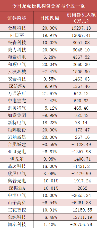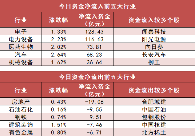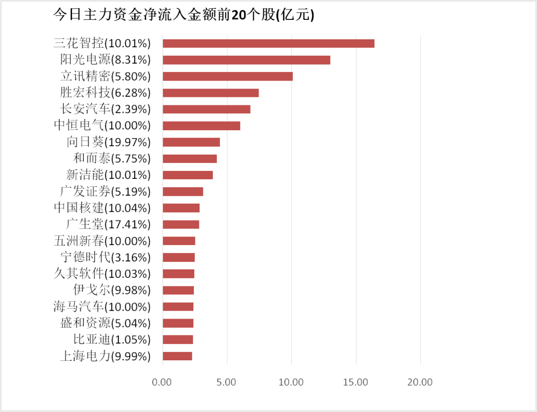 10月15日,A股市场整体上涨。 截至收盘,上证指数收报3912.21点,上涨1.22%,深证成指收报13118.75点,上涨1.73%,创业板指收报3025.87点,上涨2.36%,北证50指数上涨1.62%。A股市场合计成交20906.55亿元,较上一交易日减少5062.61亿元。 1.A股市场全天主力资金净流出92.94亿元 今日(10月15日)A股市场主力资金开盘净流出93.74亿元,尾盘净流入39.27亿元,A股市场全天主力资金净流出92.94亿元。 2.沪深300今日主力资金净流入27.77亿元 沪深300今日(10月15日)主力资金净流入27.77亿元,创业板净流出27.27亿元,科创板净流出22.98亿元。 3.电子行业净流入128.43亿元居首 申万一级行业中,20个行业实现资金净流入,其中电子行业净流入128.43亿元居首。 4.三花智控主力资金净流入16.42亿元居首 (注:此表为主力资金净流入统计,与上一张表及下一张表的机构净买入统计口径均不同) 5.龙虎榜机构抢筹多股 盘后龙虎榜数据显示,机构现身多股,其中金盘科技等股票呈现机构资金净买入,闻泰科技等股票呈现机构资金净卖出。 6.机构最新关注个股 校对:杨立林 |