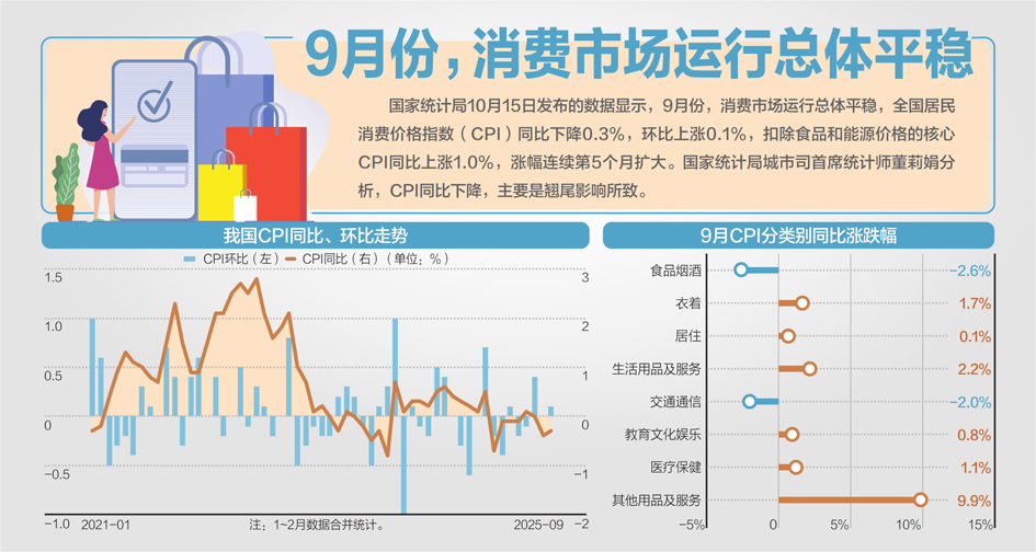 10月15日,国家统计局公布9月份物价情况。 数据显示,9月份,居民消费价格指数(CPI)环比上涨0.1%,同比下降0.3%,扣除食品和能源价格的核心CPI同比上涨1%,涨幅连续5个月扩大,也是近19个月以来涨幅首次回到1%。此外,工业生产者出厂价格指数(PPI)环比继续持平;同比下降2.3%,降幅比上月收窄0.6个百分点。 每日经济新闻 东方金诚研究发展部执行总监冯琳认为,从近期政策动向上看,反内卷、促消费对汽车、家电等重点商品价格的支撑作用在10月有望延续,而服务价格同比涨幅或将有所回落。预计在上年同期基数下沉、促消费政策效应显现等带动下,10月CPI同比有望升至0.1%左右。 CPI环比季节性上升 国家统计局城市司首席统计师董莉娟在解读数据时表示,CPI同比下降,主要是翘尾影响所致。9月CPI的同比变动中,翘尾影响约为-0.8个百分点,今年价格变动的新影响约为0.5个百分点。其中,食品价格下降4.4%,降幅比上月扩大0.1个百分点,影响CPI同比下降约0.83个百分点,是影响CPI同比下降的主要因素。 诚通证券研报指出,9月食品价格同比下跌主要受两个分项拖累。一个是鲜菜价格,同比下降13.7%,主要受去年同期高基数因素影响。另一个是猪肉价格,同比下跌17%。过去一年,猪肉价格走出一波下跌趋势,从去年8月份的高点下跌33%。猪肉价格对短期经济周期反应较为敏感,这个趋势应该引起重视。 冯琳在接受《每日经济新闻》记者微信采访时表示,促消费政策效应持续显现,9月家电、手机价格同比涨幅扩大;同时,近期国际金价大幅上涨也有一定拉动作用。这些抵消了9月食品CPI同比降幅扩大的影响,带动整体CPI同比降幅收窄,也是9月扣除波动较大的食品能源价格、更能反映基本物价水平的核心CPI同比升至1%的主要原因。 此外,冯琳认为,9月CPI环比上升0.1%,符合季节性规律,涨幅低于过去10年历史平均水平,显示当前物价上涨动能偏弱。 冯琳表示,7月以来反内卷措施持续推进,9月汽车“价格战”继续受到约束,当月交通工具价格环比小幅下降0.1%,降幅明显低于6月之前,交通工具价格同比降幅继续处于1.9%的近期偏低水平。9月暑期过后服务消费降温,加之中秋节错月,带动居民出行和文娱价格环比下行明显,但由于去年同期价格基数偏低,9月服务价格同比增速继续保持在0.6%。 冯琳预计,在上年同期基数下沉、促消费政策效应显现等带动下,10月CPI同比有望升至0.1%左右。后期伴随上年同期物价基数显著下沉,加之包括以旧换新等在内的稳增长政策会进一步发力,CPI同比预计会脱离零值附近,有望在年底前升至0.5%至1.0%区间。 PPI环比继续持平 9月份,PPI同比下降2.3%,降幅比上月收窄0.6个百分点,环比继续持平。 冯琳认为,PPI环比延续持平,背后反映出尽管国际原油价格企稳、铜价上扬,但国内需求仍显不足,国内主导商品价格整体表现偏弱。同时,受国际贸易环境不确定性影响,部分出口占比较大的行业价格继续承压。 中泰证券研究所政策组首席分析师杨畅在接受《每日经济新闻》记者微信采访时表示,由于上年基数继续走低,使得9月PPI同比降幅出现收窄。 具体来看,9月反内卷相关商品价格走势分化。其中,煤炭价格环比上涨,水泥价格总体回落,螺纹钢价格环比下跌。此外,受国际贸易环境不确定性影响,部分出口占比较大的行业价格继续承压,9月木材加工、计算机通信和其他电子设备制造、通用设备制造、汽车制造等行业PPI环比均有所下跌。 谈及PPI未来的走势,杨畅认为,由于生产资料价格指数较PPI同比增速存在较为明显的提前性,进入10月以来仍在底部运动,且有所回落,生产端价格的抬升仍有压力。 冯琳判断,在反内卷措施带动原材料价格上涨势头减弱的同时,近期外部经贸环境波动也对国内工业品价格带来新的下行压力。从国际大宗商品价格来看,10月以来,尽管铜价继续上扬,但原油价格出现大幅下跌。预计10月PPI环比仍将延续持平。加之去年10月开始PPI基数稳中有升,10月PPI同比降幅收窄势头将明显放缓,预计同比降幅将在2.2%左右,年底转正的难度很大。 |