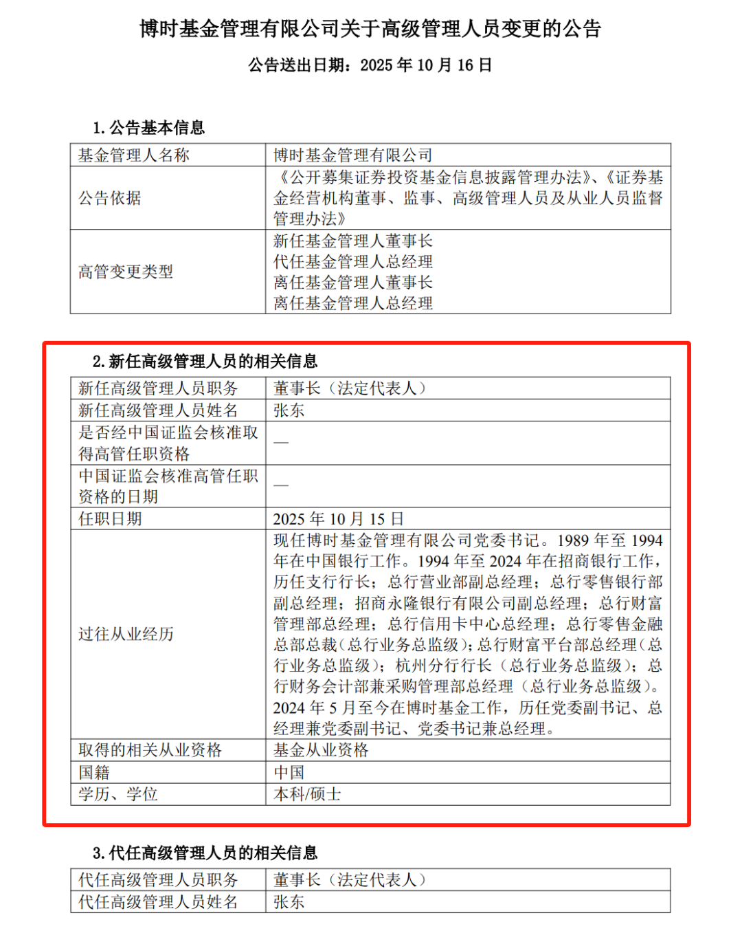 基金行业“老五家”之一、管理规模超万亿元的博时基金,高管变更终于尘埃落定。 10月15日晚间,博时基金发布公告称,江向阳因工作安排辞任博时基金董事长一职,转赴招商局融资租赁有限公司履新。而博时基金党委书记、总经理张东,正式接任董事长,并自当日起代为履行总经理职务,实现高管团队平稳过渡。 江向阳自2015年7月起担任博时基金总经理,2020年4月接任董事长,执掌公司超十年,从刚接手时的3027亿元,到如今的超1.8万亿元管理规模,他在博时基金的发展史上留下了不可磨灭的一笔。而“接任者”张东深耕金融行业超36年,在招商系工作长达31年,未来或给博时基金带来新的精彩。 “掌舵”博时超10年,江向阳调任 刚刚,博时基金发布高级管理人员变更公告称,经博时基金第九届董事会2025年第五次临时会议决议,同意江向阳因工作安排辞任公司董事长。博时基金对江向阳在任期间做出的重要贡献表示衷心感谢。 博时基金党委书记、总经理张东正式接任公司董事长,同时自10月15日起代为履行公司总经理职务,实现高管人员平稳过渡。 从江向阳的经历看,他在加入博时基金之前,从事监管工作20余年,历任中国证监会期货监管部副处长、处长,中国证监会深圳专员办处长、副专员,中国证监会办公厅副巡视员,中国证监会办公厅、党办副主任兼新闻办(网信办)主任。2015年1月,任招商局金融集团副总经理。 在2015年7月,A股市场进入深度调整阶段,博时基金也在低谷徘徊,江向阳于此时担任博时基金总经理,后又在2020年4月接任董事长,执掌公司超十年。在任期间,博时基金持续完善价值投资体系,持续打造固收优势,推动公司全面发展,管理规模稳居行业前十。 近年来,在公募基金行业高质量发展要求的大背景下,江向阳提出体系化投资的高质量发展改革思路,通过建设科技投资体系、指数化业务作战体系、多元资产体系化投资和数字信息化平台,博时科创系列产品爆发式增长,“固收大厂”优势依然巩固,“固收+”投资业绩稳步提升,非货ETF管理规模突破2200亿元。 业内人士表示,江向阳凭借对金融行业深刻的洞察和敏锐的战略眼光,在任期间实现了公司规模的飞跃发展,为博时基金的高质量发展奠定了重要基础。 张东接任公司董事长,金融及财富管理积淀深厚 公告还显示,张东正式接任博时基金党委书记、董事长,并自2025年10月15日起代任总经理一职。 公开履历显示,张东1989年8月至1994年6月在中国银行工作。1994年6月至2024年5月在招商银行工作,历任支行行长;总行营业部副总经理;总行零售银行部副总经理;招商永隆银行有限公司副总经理;总行财富管理部总经理;总行信用卡中心总经理;总行零售金融总部总裁(总行业务总监级);总行财富平台部总经理(总行业务总监级);杭州分行行长(总行业务总监级);总行财务会计部兼采购管理部总经理(总行业务总监级)。曾先后担任招商永隆银行、招银理财、招商信诺、招银国际董事,中国基金业协会理事。2024年5月起任博时基金总经理。 张东深耕金融行业超36年,在招商系工作长达31年,在财富管理领域的积淀尤为深厚,全程参与和推动了招行财富管理体系的构建发展并形成了领先优势。 张东任职总经理期间,带领博时基金积极践行公募基金高质量发展,坚持“稳”字当头,增强内生增长动力,全面提升核心竞争力,持续为持有人的财富增长贡献力量。公司在复杂的市场环境中实现稳中有进,进中向优,市场地位得到进一步巩固。 业内分析,此次博时基金高级管理人员实现平稳交接,是公司一贯稳健经营风格的体现。在公募基金行业生态深刻变革、市场竞争进一步加剧的背景下,张东在金融和财富管理等领域积累的深厚发展经验,有利于进一步发挥公司资源禀赋,为博时基金未来的高质量发展增添优势。 资产管理总规模已达1.8万亿元 作为中国最早的“老五家”之一,博时基金已成长为综合实力强劲的万亿级巨头。 截至2025年9月30日,博时基金(含子公司)管理资产总规模逾1.8万亿元,累计服务客户总数超过1.8亿人。博时基金定期报告数据显示,2024年公司旗下基金为基民赚取411亿元,2025年上半年为基民赚了超299亿元,在价值创造上保持行业领先。 招商证券半年报显示,2025年上半年,博时基金实现营业收入23.56亿元,净利润为7.63亿元,经营业绩稳中有升,高质量转型稳步推进。 关于公司下一步战略发展方向,博时基金表示,将坚持价值导向与长期主义,把握市场机遇,强化固收和权益、主动和被动、场内和场外、线上和线下、境内和境外协调发展,积极做好客户价值的创造者、投资价值的发现者、高质量发展的引领者和金融强国的建设者。 |