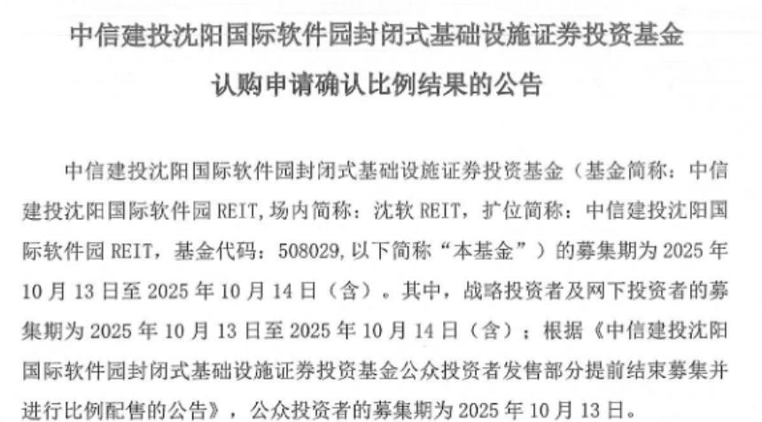 同日,中信建投沈阳国际软件园REIT的认购申请确认比例结果出炉。