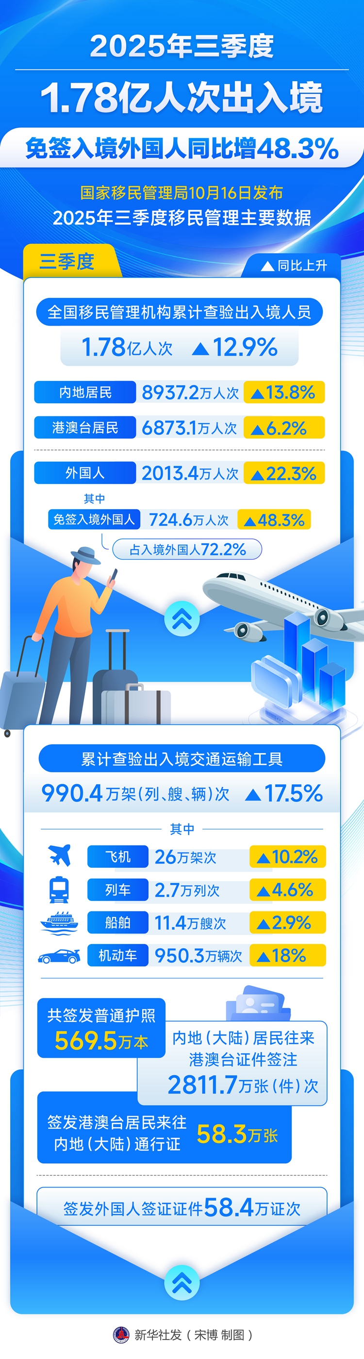 新华社北京10月16日电(记者 任沁沁)国家移民管理局16日发布2025年三季度移民管理主要数据。三季度,全国移民管理机构累计查验出入境人员1.78亿人次,同比上升12.9%。内地居民8937.2万人次、港澳台居民6873.1万人次,同比分别上升13.8%、6.2%;外国人2013.4万人次,同比上升22.3%。其中免签入境外国人724.6万人次、占入境外国人72.2%,同比上升48.3%。 累计查验出入境交通运输工具990.4万架(列、艘、辆)次,同比上升17.5%。其中飞机26万架次、列车2.7万列次、船舶11.4万艘次、机动车950.3万辆次,同比分别上升10.2%、4.6%、2.9%、18%。共签发普通护照569.5万本、内地(大陆)居民往来港澳台证件签注2811.7万张(件)次,签发港澳台居民来往内地(大陆)通行证58.3万张;签发外国人签证证件58.4万证次。 移民局政务服务平台为中外出入境人员提供查询等政务服务5421万人次,为港澳台居民、海外华侨和外国人免费提供身份核验服务1927万人次;国家移民管理机构12367服务平台受理中外人员咨询等197.67万人次,涉及全球100多个国家和地区,平均满意率达99.48%。 共侦办妨害国(边)境管理犯罪案件4838起,抓获犯罪嫌疑人1.53万余人,打掉犯罪团伙134个。其中,挂牌督办重特大案件43起。严厉打击边境地区涉枪爆、贩毒等违法犯罪,破获毒品案件84起,抓获犯罪嫌疑人100人,缴获各类毒品1.35吨,其中破获万克以上案件15起;查缴各类枪支726支,子弹2.46万余发。 责编:刘茜 一审:刘茜 二审:印奕帆 三审:谭登 来源:新华网 |