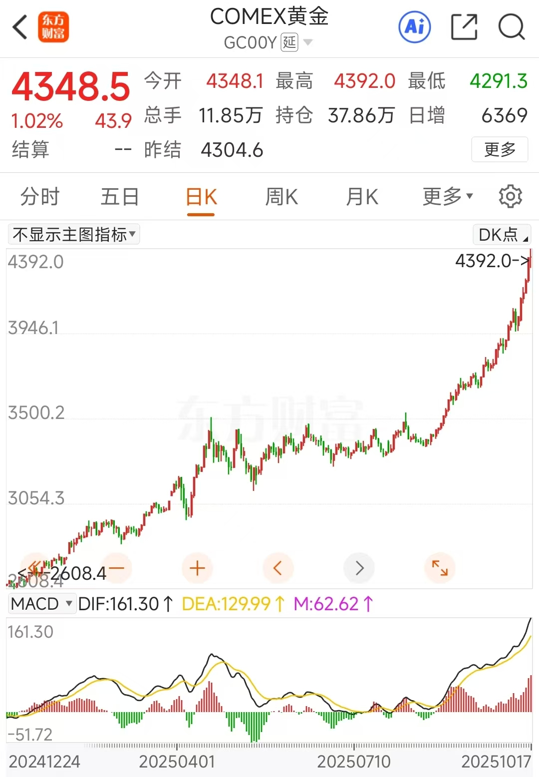 珠宝首饰、贵金属板块在10月17日早盘逆市走强,早盘收盘时贵金属涨2.15%,珠宝首饰涨0.78%。个股而言,萃华珠宝涨超6%,西部黄金涨超5%,晓程科技、山东黄金、中金黄金涨超3%。 今年以来,贵金属板块持续走强,截至10月16日收盘累计上涨105.97%。板块中招金黄金、西部黄金、湖南白银、中金黄金、赤峰黄金这5股年内纷纷翻倍。招金黄金以263.98%的涨幅居首。 ![]() 金价一度逼近4400美元 贵金属、珠宝首饰板块的强势,很大程度上受国际金价持续狂飙的带动。COMEX黄金在10月16日大涨3.4%并突破4300美元,10月17日早盘继续拉升并一度逼近4400美元,最高触及4392美元/盎司。今年以来,COMEX黄金已累计涨超60%。 ![]() 三大因素刺激黄金走强 综合市场来看,对于金价节节攀升的缘由,以下三个方面是谈论较多的: 一是说美联储降息周期内,金价往往有强势表现。摩根士丹利金属与矿业商品策略师艾米·戈维尔表示,回顾从20世纪90年代至今的历史,平均而言,在美联储降息周期开始后的60天内,黄金和白银的价格分别上涨了6%和 4%,因为降息将使得黄金这类非收益性资产更有竞争力。 当下而言,信达期货表示,美联储已开启降息周期,尽管短期内单次降息的边际利多效应可能有所弱化,但宽松进程将持续为黄金提供中期支撑。 美联储利率观测工具的最新数据显示,美联储10月降息25个基点的概率达92.6%,12月继续降息25个基点的概率达86.5%。目前美联储的目标利率区间为4%~4.25%。 ![]() 另据证券时报报道,美联储内部的降息路径分歧也在加大。美东时间10月16日,美联储新任理事米兰表示,支持在10月议息会议上降息50个基点。同日,美联储理事沃勒表示,他主张维持每次25个基点的谨慎降息步伐以应对疲软的劳动力市场。 二是美国政府“停摆”所带来的避险情绪。因美国两党未能在医保相关福利支出等方面达成一致,当地时间10月1日起,美国联邦政府时隔7年后再次“停摆”。投资者认为,作为全球第一大经济体,美国政府的“停摆”将大幅放大全球宏观与经济增长层面的不确定性。 安永的一项预测显示,政府“停摆”可能导致每周国内生产总值增长减少70亿美元,相当于第四季度经济增长率下降0.1个百分点。而白宫经济顾问委员会的一份备忘录更加悲观,认为“停摆”每持续一周,就可能导致美国GDP损失150亿美元。 三是在逆全球化大背景下叠加美债信用风险短期难以化解,去美元化进程中的储备货币多元化或仍支撑央行购金需求。 世界黄金协会最新表示,从战略层面看,黄金的总体持仓依然处于低位。据世界黄金协会制作的数据表,目前散户黄金投资占全球资产的比重在2%以下,央行黄金占外汇储备总量的比重在30%以下,两者占比均远未触及1980年的历史高位。截至今年6月末,世界黄金协会的数据显示,全球官方黄金储备达36274吨,创下历史新高。 而我国披露的数据显示,央行已连续11个月增持黄金,截至9月末中国官方黄金储备为7406万盎司。 ![]() 金价有望冲击6000美元? 除了前述被较多谈及的因素外,地缘冲突、贸易摩擦等因素,同样也刺激着金价走强。而在这些因素的作用下,即使黄金已录得可观的涨幅,不少机构对于金价的未来走势,仍然十分乐观。 比如华尔街金融巨头高盛已经将该机构对于2026年12月现货黄金价格的预测从每盎司4300美元大幅上调至4900美元。 另一华尔街大行美国银行给出的预测更加激进。来自美国银行的策略师们表示,黄金价格有望在明年春季冲击6000美元。美银的一项统计数据显示,黄金资产在全球投资机构和私人客户资产配置中的占比仍然偏低,分别仅为2.3%和0.5%,这表明市场对黄金的结构性多头配置并不拥挤。 欧洲金融巨头德意志银行的一份研报则显示,该机构预计已经突破4000美元的黄金价格不会陷入大幅回调,可能只是会在一段时期内停滞不前,稍作调整后有望继续创新高之势。 澳新银行的分析师在最新研报中表示,在全球地缘政治和经济形势不确定性加剧以及美联储放松政策的宏观背景下,金价涨势可能将持续下去。 两大交易所提示风险 在一片沸腾声中,针对近期国际贵金属价格波动剧烈,上海黄金交易所10月16日向各会员单位发布关于做好近期市场风险控制工作的通知。通知称,近期影响市场不稳定的因素较多,国际贵金属价格波动剧烈。请各会员提高风险防范意识,继续做好风险应急预案,维护市场平稳运行。同时,提示投资者做好风险防范工作,合理控制仓位,理性投资。 同日,上期所发布通知称,近期国际形势复杂多变,贵金属市场波动较大,请各有关单位采取相应措施,提示投资者做好风险防范工作,理性投资,共同维护市场平稳运行。 除了前述两大交易所外,近日工商银行、建设银行等多家银行发布提示,近期国内外贵金属价格波动加剧,市场风险提升。建议投资者基于财务状况及风险承受能力理性投资,合理安排贵金属资产规模。 (文章来源:东方财富研究中心) |