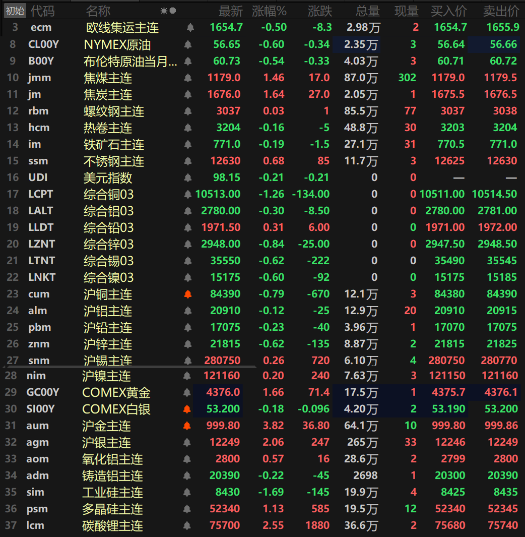 SMM 10月17日讯: 金属市场: 截至日间收盘,内盘基本金属普跌,仅沪锡、沪镍一同飘红,沪锡涨0.26%,沪镍涨0.2%。沪铜以0.79%的跌幅领跌,其余金属跌幅均在1%以内。氧化铝主连涨0.57%,铸造铝主连跌0.22%。 此外,碳酸锂主连涨2.55%,录得两连涨;多晶硅涨1.13%,录得五连阳。工业硅跌1.69%,欧线集运主连跌0.5%报1654.7。 黑色系方面涨跌互现,不锈钢涨0.68%,铁矿跌0.19%,双焦一同涨逾1%,焦煤涨1.46%,焦炭涨1.64%。 外盘方面,截至15:04分,外盘基本金属普跌,仅伦铅唯一上涨,涨幅达0.31%。伦铜以1.26%的跌幅领跌,伦锌跌0.84%,其余金属跌幅均在1%以内。 贵金属方面,截至15:04分,COMEX黄金涨1.66%,其盘中最高冲至4392美元/盎司,6连涨的同时续刷其上市以来的历史新高;COMEX白银跌0.18%,盘中最高冲至53.765美元/盎司的历史高位后回落转跌;国内方面,沪金涨3.82%,其盘中最高冲至1001元/克,成功突破1000元/克的整数关口,截至日间收盘,沪金主连收于999.8元/克;沪银涨2.06%,盘中最高冲至12366元/千克,同样续刷上市以来的历史新高,录得五连涨。 截至今日15:04分行情