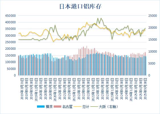 贸易公司日本丸红商事(Marubeni Corp)表示,截至2025年9月底,日本三大港口铝库存增至341,300吨,较前月增长1.8%。具体来看,横滨库存下滑,名古屋和大阪库存增加。在需求低迷的情况下,日本第四季度铝升水谈判久拖不决。