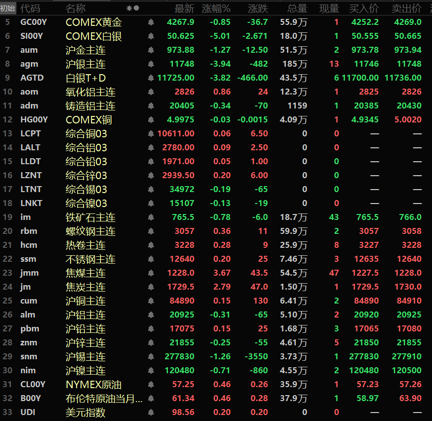 SMM10月18日讯: 金属市场方面: 隔夜内盘基本金属普跌,沪锡跌1.26%。沪铜涨0.15%。沪镍跌0.71%。沪铅涨0.15%。沪铝跌0.31%,沪锌跌0.25%。此外,氧化铝主力期货涨0.86%,铸造铝主连跌0.34%。 隔夜黑色系均飘红,铁矿涨0.36%,不锈钢涨0.27%,螺纹钢涨0.28%,热卷涨0.2%。双焦方面:焦煤涨3.67%,焦炭涨2.79%。 隔夜外盘金属方面,LME基本金属普涨,伦铜涨0.06%,伦铝涨0.09%,伦铅涨0.05%,伦锌涨0.2%,伦锡跌0.19%,伦镍跌0.13%。 隔夜贵金属方面:COMEX黄金跌0.85%,COMEX黄金周线九连涨,当周涨6.69%;COMEX白银跌5.01%,COMEX白银周线收阳,当周涨7.15%。隔夜沪金跌1.27%,其周线连涨四周,当周涨9.94%;沪银跌3.94%,沪银周线连涨8周,当周涨9.24%。 截至10月18日8:53分,隔夜收盘行情 》点击查看SMM期货数据看板 宏观面 国内方面: 【国常会:要加快完善绿色贸易政策制度体系】据央视新闻,李强主持召开国务院常务会议,部署拓展绿色贸易的有关举措。会议指出,发展绿色贸易是促进贸易优化升级、助力实现碳达峰碳中和目标、加快建设贸易强国的重要举措。要加快完善绿色贸易政策制度体系,加强与产业、科技、财税、金融等政策衔接协同,为绿色贸易发展营造良好环境。要提升外贸企业绿色低碳发展能力,推动企业开展绿色设计和生产,建设绿色贸易公共服务平台。要拓展相关产品和技术进出口,加强国际交流与沟通,加快建立与国际接轨的绿色低碳产品、技术和服务标准体系。 【财政部等三部门:11月1日起纳税人销售自产的利用海上风力生产的电力产品 增值税即征即退50%】财政部等三部门就调整风力发电等增值税政策有关事项公告如下:一、自2025年11月1日起至2027年12月31日,对纳税人销售自产的利用海上风力生产的电力产品,实行增值税即征即退50%的政策。二、2025年10月31日前已正式商业投产的核电机组,继续按照《财政部 国家税务总局关于核电行业税收政策有关问题的通知》(财税〔2008〕38号)有关增值税规定执行;2025年10月31日前国务院已核准但尚未正式商业投产的核电机组,核力发电企业生产销售电力产品,自正式商业投产次月起10个年度内,实行增值税先征后退政策,退税比例为已入库税款的50%,其他增值税规定继续按照《财政部 国家税务总局关于核电行业税收政策有关问题的通知》(财税〔2008〕38号)执行。2025年11月1日后核准的核电机组,不再实行增值税先征后退政策。三、现行规定与本公告不一致的,以本公告为准。《财政部 国家税务总局关于风力发电增值税政策的通知》(财税〔2015〕74号)等文件规定自2025年11月1日起废止。 【商务部等:支持地方以适当形式推介各行业各领域优质服务 帮助企业有效识别、精准匹配出海服务资源】商务部、外交部、国家发展改革委、工业和信息化部、国务院国资委发布《关于进一步完善海外综合服务体系的指导意见》,其中提出,探索创新服务模式。鼓励有条件的地方依托自由贸易试验区、自由贸易港、国家服务业扩大开放综合示范区等,发挥开放枢纽、总部经济、服务资源等优势,主动对接国际高标准经贸规则,开展首创性、集成式探索,打造出海综合服务港。支持地方以适当形式推介各行业各领域优质服务,帮助企业有效识别、精准匹配出海服务资源。支持京津冀、长三角、粤港澳大湾区等区域优势互补,高效整合优质服务资源,形成协同效应。依托港澳地区在跨境投资贸易、金融、法律等领域优势,拓展经贸合作机制,加强服务机构联动,共同增强服务企业出海能力。 【国家能源局:到“十五五”末 煤炭洗选设施高水平满足原煤入选需要】国家能源局发布关于加快推进煤炭洗选高质量发展的意见,到“十五五”末,煤炭洗选设施高水平满足原煤入选需要,洗选产能结构持续优化,智能化选煤厂建设取得重要进展,干法选煤技术逐步推广应用,原煤入选率稳步提高,煤炭产品上下游衔接更加顺畅,为促进煤炭清洁高效利用提供重要支撑。 【中汽协:9月商用车产销分别完成37.6万辆和36.8万辆 环比分别增长19.3%和16.3%】据中国汽车工业协会分析,9月,在商用车主要品种中,客车和货车产销环比、同比均呈两位数增长。2025年9月,商用车产销分别完成37.6万辆和36.8万辆,环比分别增长19.3%和16.3%,同比分别增长27.7%和29.6%。2025年1-9月,商用车产销分别完成309.1万辆和311.7万辆,同比分别增长9.4%和7.8%。 美元方面: 隔夜美元指数涨0.2%,报98.56。周线方面:美元指数周线下跌,当周跌0.28%。圣路易斯联邦储备银行总裁穆萨莱姆周五表示,他可能支持本月底的美联储降息,但同时警告,美联储在降低信贷成本方面不应过度,因为通胀风险仍未完全解除。市场预计美联储将在10月份的会议上降息25个基点,并在12月份再次下调。美国联邦政府的停摆也窒碍了关键宏观经济数据的发布,使市场对美国经济情况的确定性低于往常。渣打银行G10外汇研究全球主管 SteveEnglander称,美元出现了一些避险卖盘此外,关于地区性银行和更广泛信贷的消息也在一定程度上打压了美元。(文华综合) 其他货币方面: 欧洲央行管委科赫尔表示,不应该对通胀在2%的小幅偏离反应过度;欧元区的通胀风险是平衡的;下一次利率行动可能是降息或加息。(财联社) 欧洲央行管理委员会成员Joachim Nagel警告,应该密切关注金融市场是否出现不稳定迹象。他说:“不可否认,就股市表现而言,我们看到集中在少数几家公司之上,它们的估值在驱