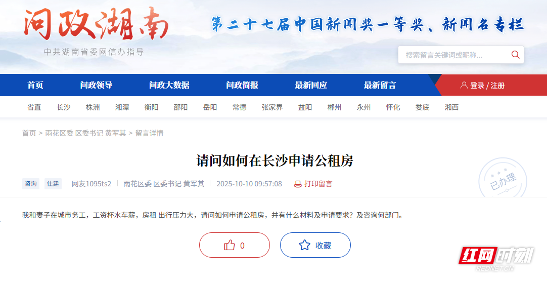 编者按:民声有呼,政必有应。红网时刻新闻客户端全新推出“时刻回ing”专栏,以“回应”践行为民初心,以“回音”彰显政务担当。专栏每日精选红网王牌栏目:《问政湖南》的铿锵回响、《百姓呼声》的热切应答、《消费维权》的责任强音,将三湘大地的“急难愁盼”化作政务服务的“行动清单”。 《问政湖南》网友的相关留言与官方回复截图。 红网时刻新闻10月20日讯(记者 陈星晓)近日,有网友在红网《问政湖南》栏目留言咨询,称与妻子在长沙务工,面临房租及生活压力,希望了解如何申请公租房,以及申报所需材料及受理部门。该问题后续获得长沙市雨花区住房和城乡建设局的详细回应。 据回复内容,外来务工人员在长沙申请非定向公租房,需同时符合四项条件: 1.本人及家庭在本市城区范围内无自有住房; 2.与本市城区用人单位签订劳动合同已满1年,且申请之日前已连续缴纳长沙市城镇职工基本养老保险1年以上(含); 3.持有本市城区有效居住证; 4.符合本市城区中等偏下收入标准。 针对市民关心的收入认定标准,回复中明确引述《长沙市公共租赁住房管理办法》:长沙市城区低收入标准为家庭人均可支配收入每月不高于3140元;中等偏下收入标准为家庭人均可支配收入每月低于3865元。 湖南省公租房系统现已在长沙正式上线运行。群众通过电脑端(湖南政务服务网)、移动端(湘易办App)申请公租房资格,可实现全程网办,并“减材料、减时间、减流程”。一次可办理8大核验事项,申报材料从14份减少至4份,群众跑动次数从11次减少至1次,办理时长从57天缩短至25天,办理环节从20个缩减至8个,租户资格年审方式由“线下核查”转变为“线上年审”,有效提升全省公租房政务服务水平。 此外,通过人脸识别、智能监控等技术,该系统实现公租房使用监督管理方式由“人防”向“人防”+“技防”转变,有效解决“小区转租监管难、上门核查取证难、房源就近分配难”的问题,实现智能监管。 为解决市民住房难题,近年来,长沙还聚焦公交职工、环卫工人、一线教师、医务人员等公益性岗位和园区产业工人等群体,推出定向配租、定向租金补贴等精准化措施。同时,通过盘活存量、配建等多种方式筹集房源,累计筹集公租房11.86万套、保障性租赁住房11.54万套,有效缓解了新市民、青年人和一线劳动者等群体的阶段性住房困难。 下一期“时刻回ing”发什么?你说了算!如果您有新闻线索、民生诉求或意见建议,欢迎留言联系。 ►时刻新闻APP:下载时刻新闻APP,登录后直接留言发帖,第一时间获取民情回应。 ►红网百姓呼声平台:登录百姓呼声页面留言发帖 ►红网问政湖南平台:登录问政湖南页面留言发帖 下载时刻新闻APP 获取更多民情最新回应↓↓↓ |
