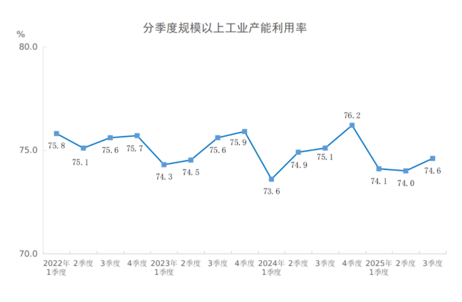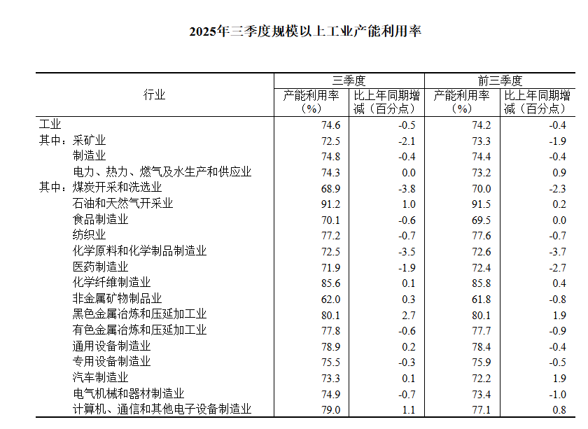 2025年三季度,全国规模以上工业产能利用率为74.6%,比二季度上升0.6个百分点,比上年同期下降0.5个百分点。 分三大门类看,2025年三季度,采矿业产能利用率为72.5%;制造业产能利用率为74.8%;电力、热力、燃气及水生产和供应业产能利用率为74.3%。 分主要行业看,2025年三季度,煤炭开采和洗选业产能利用率为68.9%,食品制造业为70.1%,纺织业为77.2%,化学原料和化学制品制造业为72.5%,非金属矿物制品业为62.0%,黑色金属冶炼和压延加工业为80.1%,有色金属冶炼和压延加工业为77.8%,通用设备制造业为78.9%,专用设备制造业为75.5%,汽车制造业为73.3%,电气机械和器材制造业为74.9%,计算机、通信和其他电子设备制造业为79.0%。