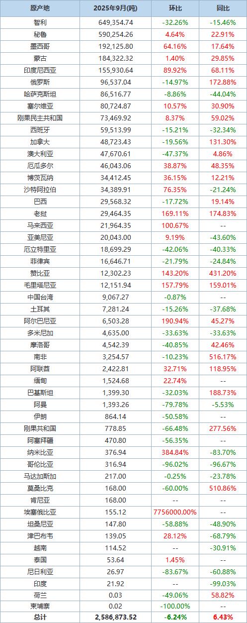 海关统计数据在线查询平台公布的数据显示,中国2025年9月铜矿砂及其精矿进口量为2,586,873.52吨,环比下降6.24%,同比上升6.43%。 智利是第一大进口来源地,当月从智利进口铜矿砂及其精矿649,354.73吨,环比下降32.26%,同比下降15.46%。 秘鲁是第二大进口来源地,当月从秘鲁进口铜矿砂及其精矿590,254.26吨,环比增加4.64%,同比增长22.91%。 以下为根据中国海关总署官网数据整理的2025年9月中国铜矿砂及其精矿进口分项数据一览表: 数据来源:海关总署 注:进口/出口总量(总计)中亦包括上表未列出的部分原产地数据 (文华综合) |
