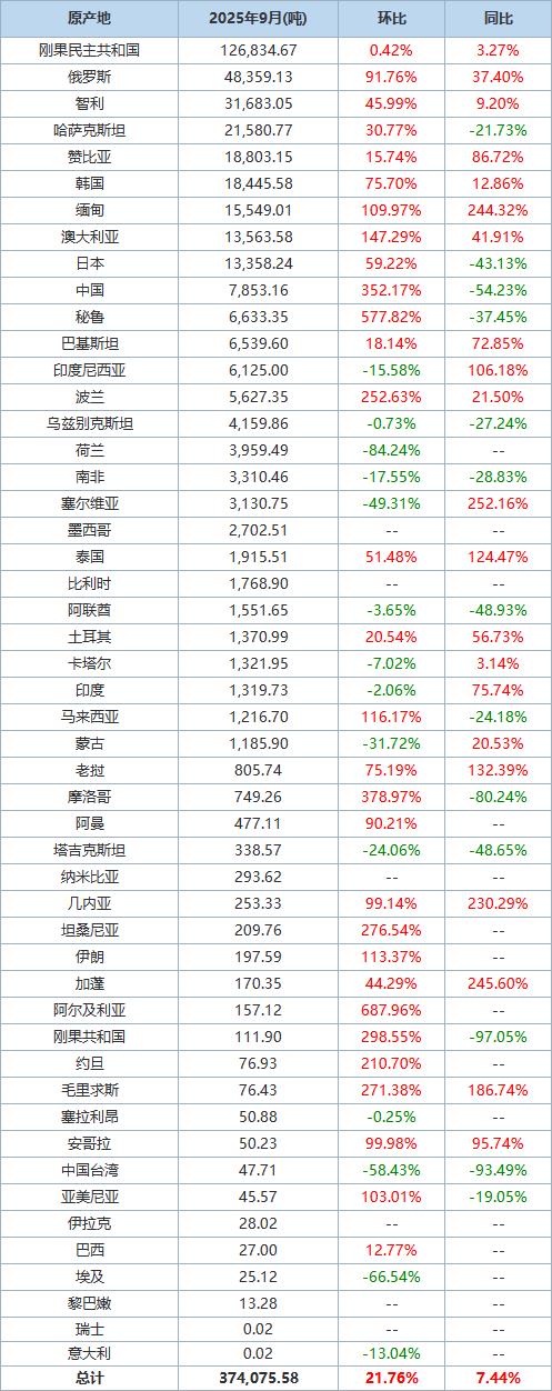 海关统计数据在线查询平台公布的数据显示,中国2025年9月精炼铜进口量为374,075.58吨,环比增长21.76%,同比增加7.44%。 刚果民主共和国是第一大进口来源地,当月从刚果民主共和国进口精炼铜126,834.67吨,环比增长0.42%,同比增加3.27%。 俄罗斯是第二大进口来源地,当月从俄罗斯进口精炼铜48,359.13吨,环比上升91.76%,同比上升37.40%。 以下为根据中国海关总署官网数据整理的2025年9月精炼铜进口分项数据一览表: 数据来源:海关总署 注:1、包括未锻轧铜含量>99.9935%的精炼铜阴极;未锻轧其他精炼铜阴极;未锻轧精炼铜线锭;未锻轧精炼铜阴极型材;未锻轧的精炼铜坯段;其他未锻轧的精炼铜。 2、进口总量(总计)中亦包括上表未列出的部分原产地数据。 (文华综合) |