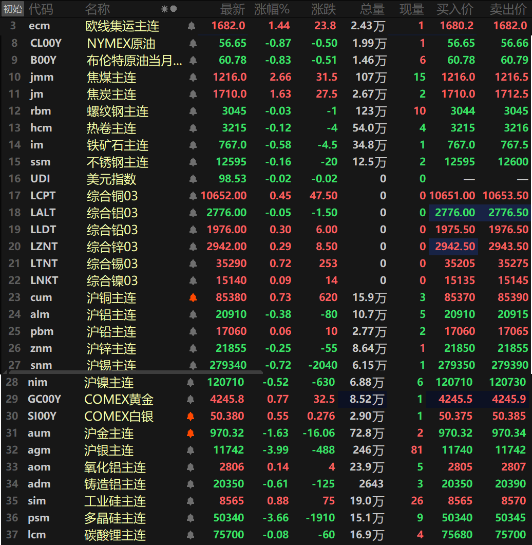SMM 10月20日讯: 金属市场: 截至日间收盘,内盘基本金属普跌,仅沪铜和沪铅一同上涨,沪铜涨0.73%,沪铅涨0.06%。沪锡以0.72%的跌幅领跌,沪镍跌0.52%,其余金属跌幅波动不大。氧化铝主连涨0.14%,铸造铝主连跌0.61%。 此外,碳酸锂主连跌0.08%,多晶硅主连跌3.66%,工业硅主连涨0.88%。欧线集运主连涨1.44%报1682。 黑色系方面,铁矿以0.58%的跌幅领跌,其余金属跌幅波动均不大。双焦方面,焦煤涨2.66%,焦炭涨1.63%。 外盘方面,截至15:03分,除了伦铝外,其余金属均上涨。伦铝跌0.05%,伦铜涨0.45%,伦锡涨0.72%,其余金属涨幅波动均不大。 贵金属方面,截至15:03分,COMEX黄金涨0.77%,COMEX白银涨0.55%。国内方面,沪金跌1.63%,沪银跌3.99%。 截至今日15:03分行情 》点击查看SMM行情看板 宏观面 国内方面: 【国家统计局:前三季度GDP同比增5.2% 9月规上工业增加值同比实际增6.5%】国家统计局10月20日发布数据显示,初步核算,2025年前三季度,中国国内生产总值(GDP)1015036亿元,按不变价格计算,同比增长5.2%。国家统计局数据显示,9月份,规模以上工业增加值同比实际增长6.5%。从环比看,9月份,规模以上工业增加值比上月增长0.64%。1—9月份,规模以上工业增加值同比增长6.2%。国家统计局新闻发言人就2025年前三季度国民经济运行情况答记者问时表示,下阶段,要认真贯彻落实党中央、国务院决策部署,加力提效实施逆周期调节,持续用力扩大内需、做强国内大循环,进一步激发市场活力、提振发展预期,不断增强内生增长动能,力促经济持续健康发展。》点击查看详情 【国家统计局:前三季度规模以上锂离子电池制造行业增加值同比增长29.8%】国家统计局新闻发言人就2025年前三季度国民经济运行情况答记者问时表示,“两新”“两重”等扩内需政策效应持续向生产端传导,带动了设备制造、消费品制造相关行业和产品生产,更推动了智能智造、绿色制造、数字技术等领域的生产扩张与技术迭代,为产业结构优化、新旧动能转换按下了“快进键”。前三季度,规模以上锂离子电池制造、船舶及相关装置制造、电机制造等行业增加值同比分别增长29.8%、22.9%、17.1%,数控锻压设备、包装专用设备等更新类产品产量分别增长11.7%、26.0%,新能源汽车、电动自行车、平板电脑等换新类产品产量分别增长29.7%、27.1%、9.5%。 【国家统计局:前三季度工业机器人、服务机器人等产品产量分别增长29.8%、16.3%】国家统计局20日发布数据显示,前三季度,规模以上高技术制造业增加值同比增长9.6%;工业机器人、服务机器人、动车组等产品产量分别增长29.8%、16.3%、8.6%。 【国家统计局:9月份70个大中城市中各线城市商品住宅销售价格同比降幅继续呈收窄态势】国家统计局数据显示,9月份,一线城市新建商品住宅销售价格同比下降0.7%,降幅比上月收窄0.2个百分点。其中,上海上涨5.6%,北京、广州和深圳分别下降2.6%、4.1%和1.8%。二、三线城市新建商品住宅销售价格同比分别下降2.1%和3.4%,降幅均收窄0.3个百分点。9月份,一线城市二手住宅销售价格同比下降3.2%,降幅比上月收窄0.3个百分点。其中,北京、上海、广州和深圳分别下降2.7%、2.4%、6.0%和1.7%。二、三线城市二手住宅销售价格同比分别下降5.0%和5.7%,降幅分别收窄0.2个和0.3个百分点。》点击查看详情 【央行公开市场今日净回笼648亿元】央行今日开展1890亿元7天逆回购操作,操作利率为1.40%,与此前持平。因今日有2538亿元逆回购到期,当日实现净回笼648亿元。 ►10月20日银行间外汇市场人民币汇率中间价为1美元对人民币7.0973元 美元方面: 截至15:03分,美元指数下跌0.02%报98.53,美国总统特朗普的言论缓解了贸易紧张局势,驱动市场转向风险资产。市场当前将目光聚焦于本周五将公布的关键美国通胀数据——9月CPI报告很可能为美联储FOMC利率决议定调。与此同时,市场正密切追踪贸易摩擦及美国政府停摆事件的最新进展。(文华综合) 宏观方面: 今日将公布中国9月全社会用电量年率-每月(不定时)、中国9月全社会用电量-每月(不定时)、美国9月非农就业人口变动季调后(10/20-10/25)、美国9月平均每小时工资年率(10/20-10/25)、美国9月失业率(10/20-10/25)、美国8月贸易帐(10/20-10/25)、美国9月PPI年率(10/20-10/25)、美国9月零售销售月率(10/20-10/25)、美国9月关联GDP的零售额控制组月率-季调后(10/20-10/25)、美国9月进口物价指数月率、美国9月进口物价指数年率、美国9月新屋开工年化总数、美国9月工业产出月率、美国9月产能利用率、美国9月制造业产出月率、美国9月制造业产能利用率、美国9月工业产出年率-季调后、美国8月批发库存月率终值(10/20-10/25)等数据。 此外,还需关注:国家统计局公布70个大中城市住宅销售价格月度报告;国新办就国民经济运行情况举行新闻发布会;二十届四中全会于10月20日至23日召开。值得注意的是:非农数据发布具体日期还没有确定,由于美国政府停摆还在持续,截至目前进行的十次临时支出法案投票均未获通过,目前长期停摆的风险加大。 原油方面: 截至15:03分,两市油价一同下跌,美油跌0.87%,布油跌0.83%,主要是受全球供应过剩忧虑打压。 Fujitomi Securities分析师Toshitaka Tazawa表示:“产油国增产导致供应过剩的担忧,加上对中美贸易紧张局势升级导致经济放缓的忧心,正在加剧抛售压力。”他说:“虽然美国正在加大对俄罗斯原油买家的压力,但美国总统特朗普和俄罗斯总统普京即将举行