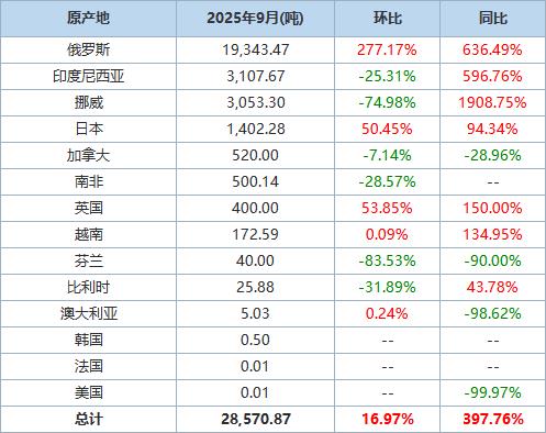 海关统计数据在线查询平台公布的数据显示,中国2025年9月未锻压镍进口量为28,570.87吨,环比增加16.97%,同比上升397.76%。 俄罗斯是第一大进口来源地,当月从俄罗斯进口未锻压镍19,343.47吨,环比增长277.17%,同比上升636.49%。 印度尼西亚是第二大进口来源地,当月从印度尼西亚进口未锻压镍3,107.67吨,环比下降25.31%,同比上升596.76%。 以下为根据中国海关总署官网数据整理的2025年9月未锻压镍进口分项数据一览表: ![]() 注:1、未锻压镍包括按重量计镍、钴总量≥99.99%,钴≤0.005%的未锻轧非合金镍;其他未锻轧非合金镍;未锻轧的镍合金。 2、进口总量(总计)中亦包括上表未列出的部分原产地数据。 |