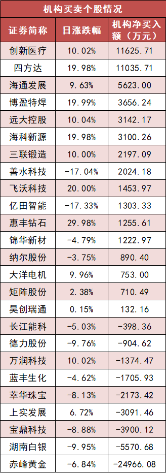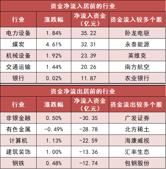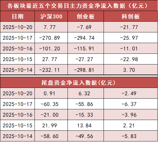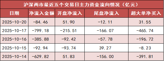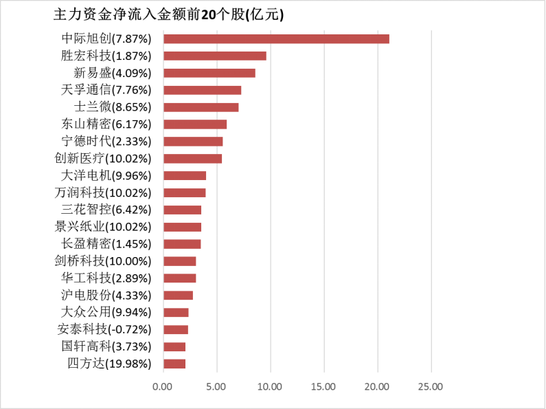 10月20日,A股市场整体上涨。 截至收盘,上证指数收报3863.89点,上涨0.63%;深证成指收报12813.21点,上涨0.98%;创业板指收报2993.45点,上涨1.98%。两市合计成交17376.05亿元,较上一交易日减少2005.11亿元。 1. 两市主力资金净流出超80亿元 今日沪深两市主力资金开盘净流入51.9亿元,尾盘净流出12.11亿元,全天净流出84.46亿元。 2. 沪深300主力资金净流入近8亿元 沪深300今日主力资金净流入7.77亿元,创业板净流出7.69亿元。 3.电力设备等行业实现净流入 4. 主力资金净流入居前20股 5.机构龙虎榜 6.机构最新关注个股 校对:冉燕青 |