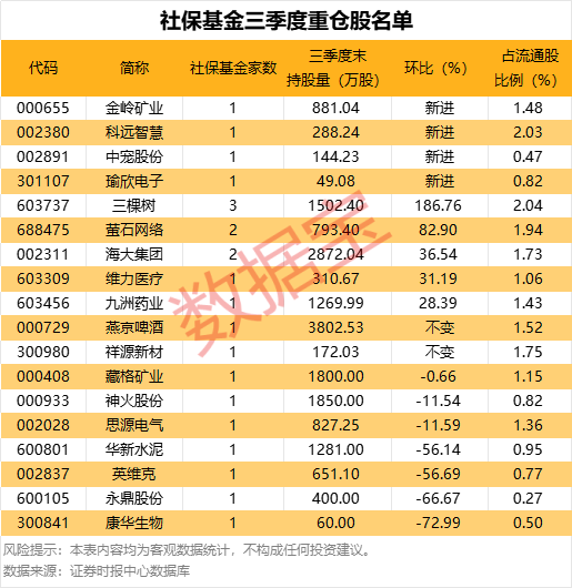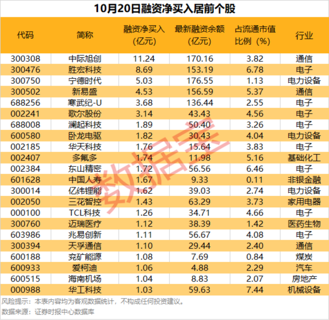 市场主要指数今日(10月21日)集体高开,近3000只股开盘上涨。 盘面上,工程机械板块大幅拉升,山河智能、建设机械涨停,铁建重工、志高机械等跟涨。 保险股延续强势,中国人寿涨超3%,中国太保涨超2%;多元金融走强,鲁信创投、瑞达期货涨停。 油气开采及服务板块延续大涨,通源石油、潜能恒信涨超6%。 培育钻石概念爆发,惠丰钻石、四方达、英诺激光涨超10%,黄河旋风涨停。存储芯片概念大涨,大为股份涨停,雅创电子、云汉芯城涨超10%。CPO概念继续强势,汇绿生态收获两连板,中富电路、源杰科技、斯瑞新材等跟涨。 22股杠杆资金加仓超1亿元 截至10月20日,市场融资余额合计2.41万亿元,较前一交易日增加3.96亿元。 具体到个股,10月20日获融资净买入千万元以上的有386只,其中22只融资净买入额超1亿元。中际旭创融资净买入额居首,当日净买入11.24亿元;其次是胜宏科技、宁德时代,融资净买入金额分别为8.69亿元、5.03亿元;融资净买入金额居前的还有新易盛、寒武纪-U、歌尔股份等。 分行业统计,获融资客净买入超1亿元个股中,电子、通信、电力设备等行业最为集中,分别有8只、3只、3只个股上榜。 社保基金三季度重仓股:新进4股,增持5股 财报季,社保基金持股动向曝光!社保基金最新出现在18只个股前十大流通股东名单中,合计持股量1.9亿股,期末持股市值合计70.45亿元。持股变动显示,新进4只,增持5只,不变2只,减持7只。 从持股比例看,社保基金持有比例最多的是三棵树,持股量占流通股比例为2.04%;其次是科远智慧,社保基金持股比例为2.03%,持股比例居前的还有萤石网络、祥源新材、海大集团等。 持股数量方面,社保基金持股量最多的是燕京啤酒,共持有3802.53万股;海大集团、神火股份等紧随其后,持股量分别为2872.04万股、1850.00万股。 养老金账户新建仓3股 三季度末养老金账户出现在春风动力、鼎通科技、润本股份、圣晖集成前十大流通股东榜;其中,3只为新进入前十大流通股东名单,分别是鼎通科技、润本股份、圣晖集成。 声明:数据宝所有资讯内容不构成投资建议,股市有风险,投资需谨慎。 校对:陶谦 |