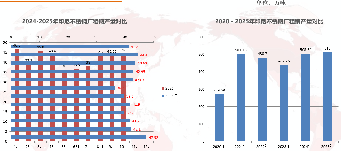 10月21日,在由上海有色网信息科技股份有限公司(SMM)主办的2025第十届亚太镍铬锰不锈钢及新能源大会上,上海力赢国际贸易总经理张军红对“中国铬铁供需平衡及2026年展望”这一主题进行了分享。 不锈钢产业综述 不锈钢产业概述 Ø中联金:2025年1-10月中国43家不锈钢企业粗钢产量约3248.97万吨,同比增加95.05万吨,同比增幅3.01%。 Ø2025年中国不锈钢粗钢产量预计达到4100-4150万吨。 Ø2025年1-10月份印尼不锈钢粗钢产量约416.05万吨,同比去年减少2.04万吨,减幅为0.49%。 Ø2025年印尼不锈钢粗钢产量将增至510万吨左右。主要来源于印尼青山产量的增加,以及印尼金达莱新产能的投产。 中国不锈钢进出口数据简析 Ø中国不锈钢进口数据 中钢协:2025年1-8月不锈钢进口量约101.76万吨,同比减少30.94;同比降幅23.32% 。主要下降国印尼。 Ø中国不锈钢出口数据 中钢协:2025年1-8月不锈钢出口量约336.42万吨,同比增加10.09万吨;同比增幅3.09%。主要出口国:越南、俄罗斯、土耳其、韩国、台湾等。 Ø中国净出口数据 中钢协: 2025年1-8月份不锈钢净出口量167.26万吨,同比增加41.03万吨;同比增幅21.19%。 行业现状 持续扩张→供需矛盾→赢利下降 铬铁产业综述 铬铁产业概述 Ø2025年1-9月份中国高碳铁铬铁产量654.06万吨,同比减少19.27万吨。 Ø 2025年中国高碳铁铬铁产能1561万吨,第四季度预计增加60万吨。 Ø2025年1-9月份内蒙高碳铁铬铁产量500.34万吨,同比增加43.18万吨,全国占比76.5%。 Ø2025年1-8月份中国高碳铬铁进口量182.93万吨,同比减少70.18万吨,同比降幅27.73%。其中,南非进口83.05万吨,占比45.4%。 此外,其还对2025年不锈钢厂高碳铬铁招标价格、2025年欧洲高碳铬铁招标价格、2024年中国不锈钢----高碳铬铁供应增量对比、2025年9月中国不锈钢----高碳铬铁供应对比、2024-2025年部分国家高碳铬铁出口量对比、2024-2025年部分国家高碳铬铁进口量对比(韩国、日本、美国、印尼)、2023-2024年分国别高碳铬铁产量对比等内容进行了阐述。 行业现状 外减内减→赢利提升→集中加剧 铬矿产业综述 Ø2024年1-8月份中国进口量1400.38万吨同比增加28.37万吨,同比增幅2.1%,其中南非为1162.72万吨占比83.03%。 Ø2025年1-7月份南非铬矿出口量1239.97万吨同比增加33.17万吨。 其从2024-2025年中国港口铬矿库存对比、2025年中国天津港40-42%南非粉价格对比、2024-2025年印尼铬矿进口量对比、2025年南非大型铬矿商40-42%南非粉期货价格以及2023-2024年分国别铬矿产量统计等角度进行了介绍。 行业现状 产能增加→巨头控盘→赢利极强 展望 最后,其结合不锈钢、铬铁以及铬矿2025年的现状对2026年的发展进行了展望。 》点击查看2025 第十届亚太镍铬锰不锈钢及新能源大会专题报道 |