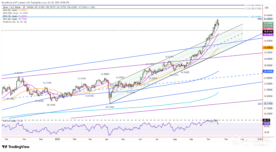 【华通白银网10月21日讯】图表走势:窄幅波动信号暂停 白银周一盘整,交投于周五51.28-52.78美元区间,并紧靠10日移动均线作为重要的短期支撑位。如果价格保持10日线上方(目前为51.28美元),那么从8月36.96美元波动低点开始的看涨结构将保持稳固,并将指向更高的价格。上周白银创下54.49美元的纪录高位,之后受看跌外包日线形态压制,涨势暂歇,这轮陡峭上涨后的回调暗示市场正迎来健康修整。 支撑水平:关键测试水平 10日均线始终承载着本轮上涨趋势,而日内低点恰好在此获得支撑,进一步印证了该均线的关键作用。决定性地跌破51.28美元是疲软的信号,而突破周五50.62美元的低点则为进一步回调铺平了道路。20日均线现报48.77美元,保持上行态势且已上穿短期上升通道上轨,这使其成为合乎逻辑的下一支撑。只有失败才会标志着更大的调整,所以要密切关注这些水平。 未来风险:动能减弱 在连续五周录得区间上三分之一收盘后,上周白银收于周线区间下半部,暗示看涨动能正在衰退。在一个月的超买后,相对强弱指标(RSI)跌破70,进一步支撑了这种降温。外包周线显现的猛烈抛压暗示市场情绪已悄然生变,若无法突破关键阻力位,任何反弹行情都将存疑。 买点形成:上行触发 突破当日52.78美元高位将预示短期走强,但只有持续突破54.49美元才能确认新的上行。在那之前,反弹将面临阻力,空头准备反击。之前的超买潮放大了回调风险,不过看涨结构目前仍保持不变。 展望:高位附近的平衡行为 如果51.28美元支撑位持续存在,白银趋势仍将保持上行,但相对强弱指标的回调和本周的疲软态势值得谨慎对待。收于52.78美元上方可保持看涨,而跌破50.62美元则将瞄准48.77美元。今天收盘的方向将提供线索,54.49美元是关键阻力位,而若支撑失守,则会出现更深层次的回调。 截止北京时间09:40,华通现货白银定盘价报11790元。 白银网 |