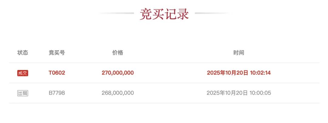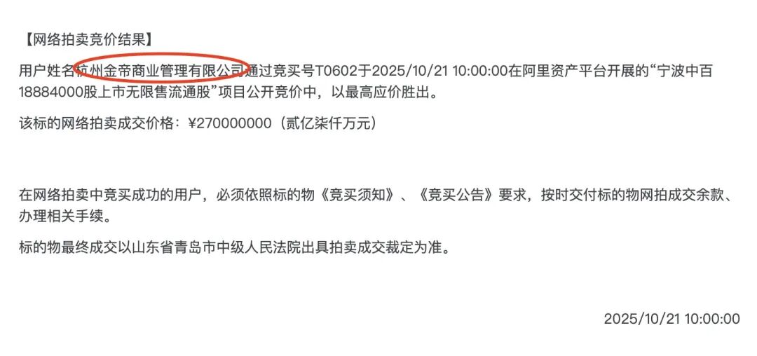 等待一个月之后,“徐翔家族”实控的宁波中百(600857)股东所持股份于10月21日被法拍成交,杭州金帝商业管理有限公司(以下简称“杭州金帝”)以2.7亿元竞得。 回顾9月22日晚间公告,宁波中百称于当日收到山东省青岛市中级人民法院(以下简称“青岛中院”)送达的拍卖通知书,该上市公司持股5%以上股东竺仁宝所持的宁波中百1888.4万股股票将于10月20日在淘宝网络司法拍卖平台上进行公开拍卖。截至公告披露日,竺仁宝上述股份处于司法冻结状态,占其所持宁波中百股份的100%,占上市公司总股本的8.42%;2025年半年报显示,竺仁宝系宁波中百第三大股东。 据淘宝网络司法拍卖平台显示,上述股权司法拍卖已于10月21日10时结束,共有3人报名参与,28898人次围观。 证券时报记者注意到,此次法拍竞争并不激烈,仅有两家竞拍买家出手。10月20日,本场法拍在杭州金帝加价之后便再无人出价,最终以2.7亿元的总价竞得宁波中百1888.4万股,折合为14.3元/股;而截至20日收盘时,宁波中百股价为17.13元/股。这意味着,法拍成交较之折价超15%。 但在今日10时法拍正式结束时,宁波中百股价却突然闪崩,很快就被砸在了跌停板上,股价跌至15.42元/股。 据悉,此次拍卖原因系青岛中院作出的(2016)鲁02刑初148号刑事判决书已经发生法律效力,该案侦查机关对涉案财产进行了查封、冻结,案件移送审判后山东省青岛市中级人民法院采取了继续查封、冻结措施,现该案已经进入执行程序。需要指出的是,该案件所涉事项为原私募大佬徐翔等人操控证券市场案,竺仁宝即竺勇的父亲,据公开信息显示,竺勇与徐翔关系密切。 再看此次竞拍得主,杭州金帝成立于2019年12月,注册资本为2000万元,经营范围包括商业综合体管理服务、集贸市场管理服务等。根据企查查数据显示,浙江金帝房地产集团有限公司(以下简称“金帝房产”)持有杭州金帝100%股权,卢斯侃系最终实际控制人。 当前,房地产市场颇为低迷,而作为民企的金帝房产似乎不惧风险,更斥巨资拿地。据媒体报道,2025年6月底,金帝房产经过近100轮的竞价,最终以总价55.78亿元竞得杭州世纪城核心单元XS010104-05地块,成交楼面价为5.45万元/㎡,溢价率为21%。根据公示,项目规划9幢17-23F高层,包含1幢17F、1幢18F、1幢20F、4幢22F和2幢23F。 除在地产领域显露锋芒外,卢斯侃旗下“金帝系”还曾介入资本市场。 4月3日,浙江金帝石油勘探开发有限公司(以下简称“金帝石油”)向*ST新潮(600777)全体股东发起部分要约,要约收购股份数量为13.6亿股,占上市公司总股本的20%,要约收购的价格为3.10元/股。企查查数据显示,金帝联合控股集团有限公司(以下简称“金帝联合控股”)持有金帝石油100%股权,而卢斯侃则持有金帝联合控股65.7143%的股份。 上述要约收购生效条件系在4月8日起至5月7日期间,预受要约的*ST新潮股票申报数量达到5.44亿股,即占*ST新潮股份总数的8%,否则本次要约收购不生效。最终,*ST新潮于5月8日晚间披露要约结果,在要约收购期限内,预受要约的股东账户总数仅为579户,预受要约股份总数共计为963.2万股,占*ST新潮目前股份总数的0.14%。 这意味着,预受要约的股份数量远未达到金帝石油要约收购生效条件要求的数量,此次要约收购自始不生效。 需要指出的是,金帝石油此次要约收购失败的转折在于伊泰B股的突然“参战”,后者在4月18日向*ST新潮股东发出要约收购报告书正式入局,以更高的要约收购价格发起收购,导致大批股东撤回预受要约。公告显示,伊泰B股提供的要约收购价格为3.40元/股,预定要约收购34.68亿股,占上市公司总股本的51%,收购所需最高资金总额为117.92亿元。 |